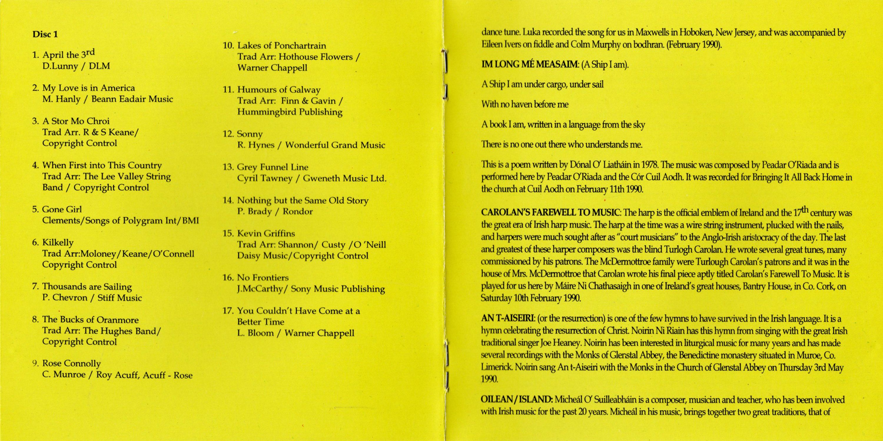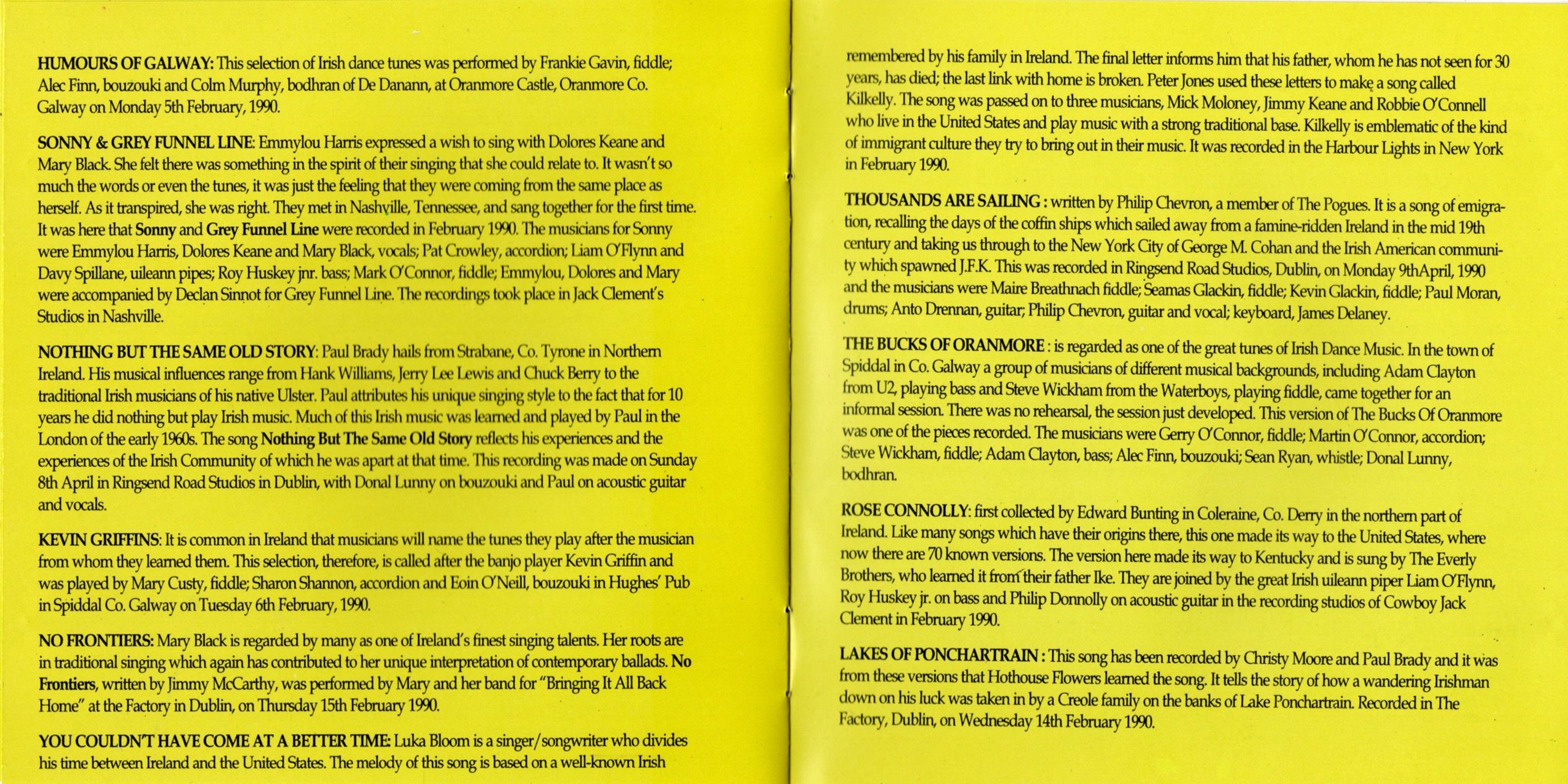 THOUSANDS ARE SAILING: written by Philip Chevron, a member of The Pogues. It is a song of emigration, recalling the days of the coffin ships which sailed away from a famine-ridden Ireland in the mid 19th century and taking us through to the New York City of George M. Cohan and the Irish American community which spawned J.F.K. This was recorded in Ringsend Road Studios, Dublin, on Monday 9th April, 1990 and the musicians were Maire Breathnach fiddle; Seamas Glackin, fiddle; Kevin Glackin, fiddle; Paul Moran, drums; Anto Drennan, guitar; Philip Chevron, guitar and vocal; keyboard, James Delaney.