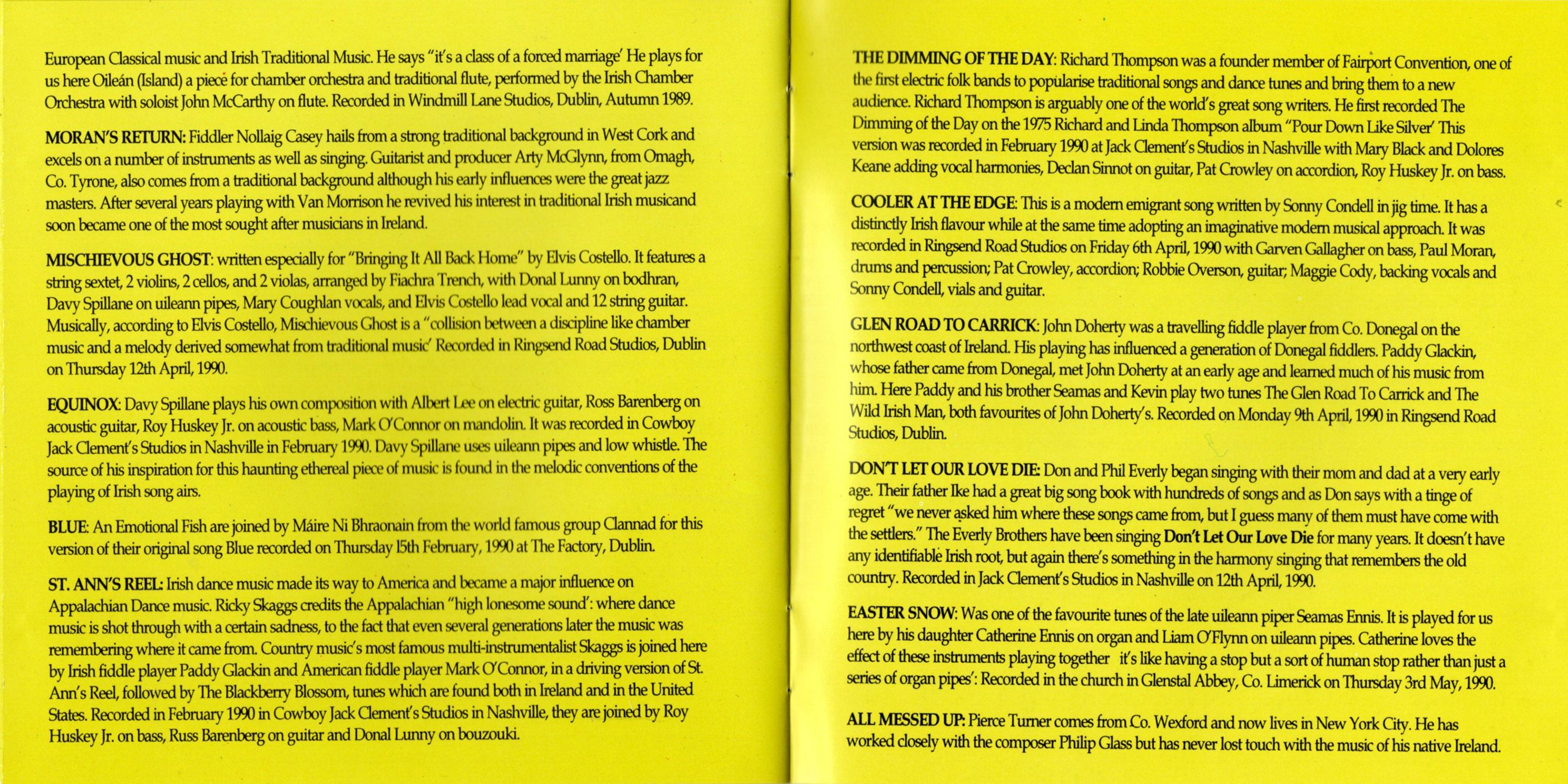 MISCHIEVOUS GHOST: written especially for "Bringing It All Back Home" by Elvis Costello. It features a string sextet, 2 violins, 2 cellos, and 2 violas, arranged by Fiachra Trench, with Dónal Lunny on bodhran, Davy Spillane on uileann pipes, Mary Coughlan vocals, and Elvis Costello lead vocal and 12 string guitar. Musically, according to Elvis Costello, Mischievous Ghost is a "collision between a discipline like chamber music and a melody derived somewhat from traditional music". Recorded in Ringsend Road Studios, Dublin on Thursday 12th April, 1990.