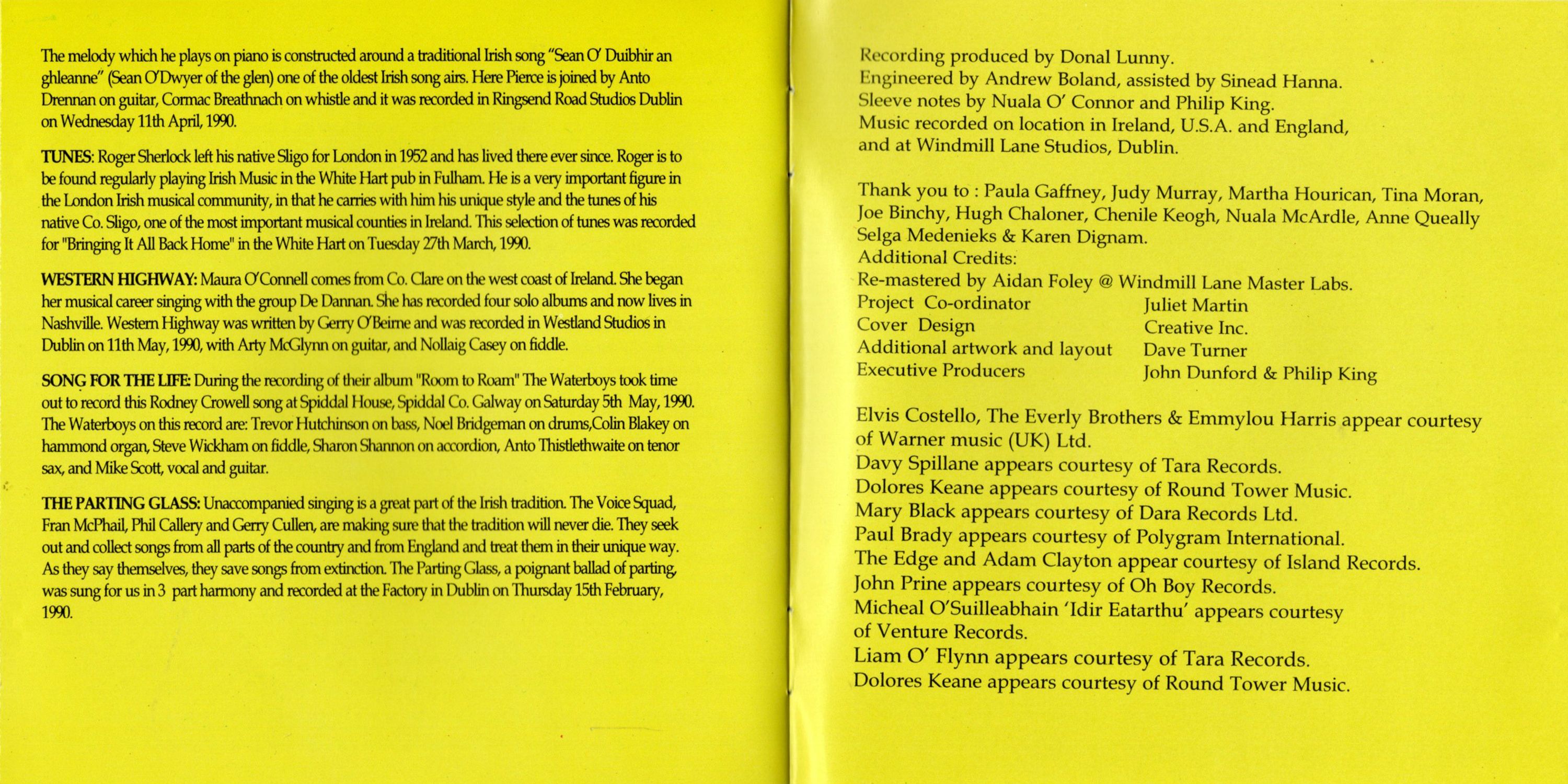 From 'Riverdance' to 'The Beauty Queen of Leenane' Ireland's cultural successes abroad have delighted foreign and home audiences alike in the last ten years. Since the Bringing It All Back Home series was first conceived in 1988, Irish culture in general and Irish music in particular has achieved a global exposure undreamt of in previous decades. This has been as much a marketing success story as a cultural event. However it has had the very beneficial effect of opening up the career prospects of musicians and artists and professionals working in the area of Irish music and has introduced Irish traditional and traditionally influenced music to a world audience. At home in Ireland the Irish music community has benefited from the prosperity generated by the 'Celtic tiger' economy. An explosion of creative activity has taken place around Irish music facilitated in part by this rising tide. With this has come an awareness that Irish traditional music is a precious resource on loan to this generation and charged with an obligation of transmission to the next. That clear unbroken line of oral transmission must remain intact if the music is to survive as a vital cultural force.