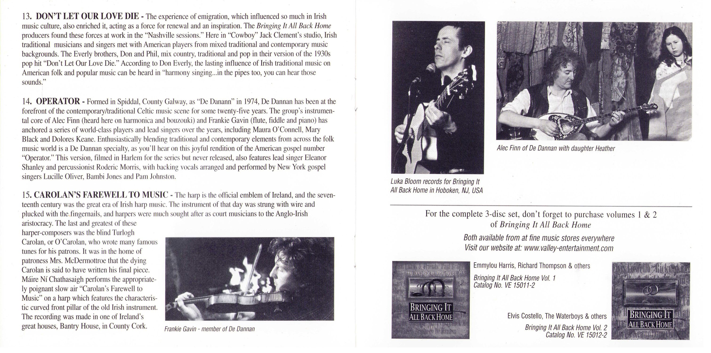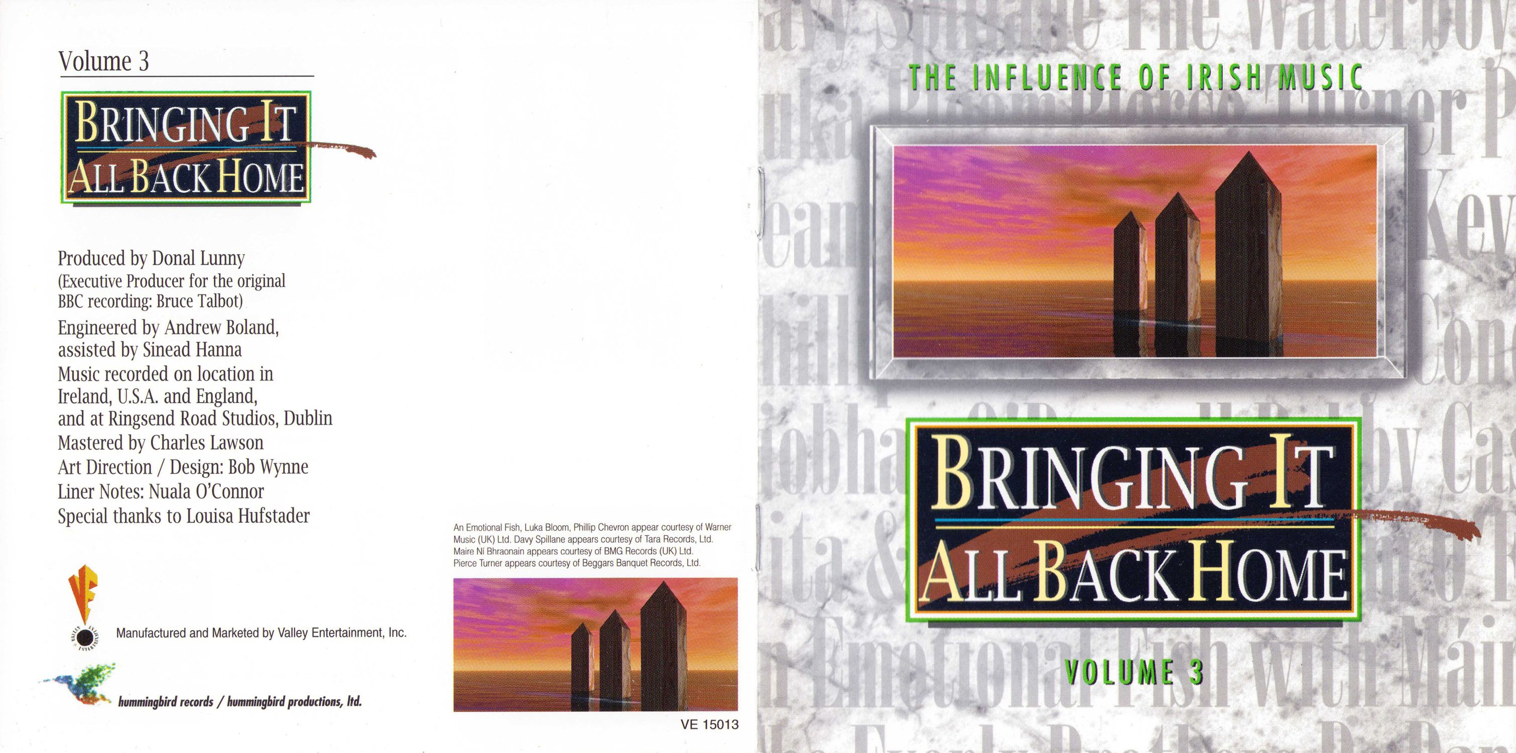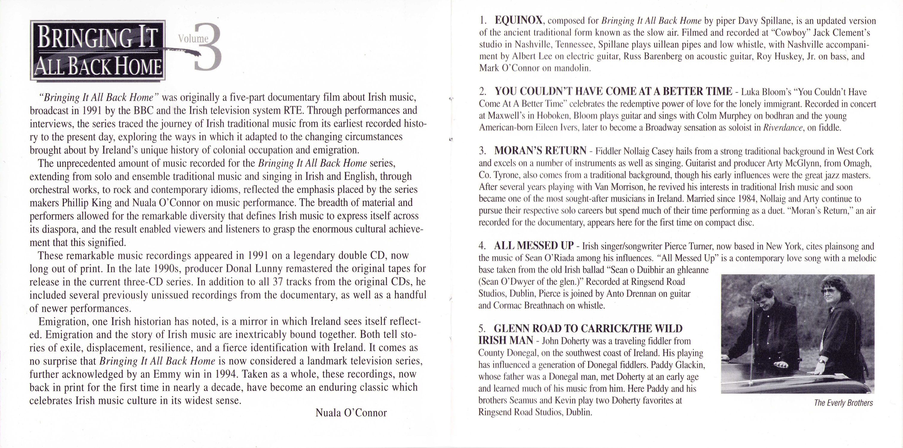 "Bringing It All Back Home" was originally a five-part documentary film about Irish music, broadcast in 1991 by the BBC and the Irish television system RTE. Through performances and interviews, the series traced the journey of Irish traditional music from its earliest recorded history to the present day, exploring the ways in which it adapted to the changing circumstances brought about by Ireland’s unique history of colonial occupation and emigration.