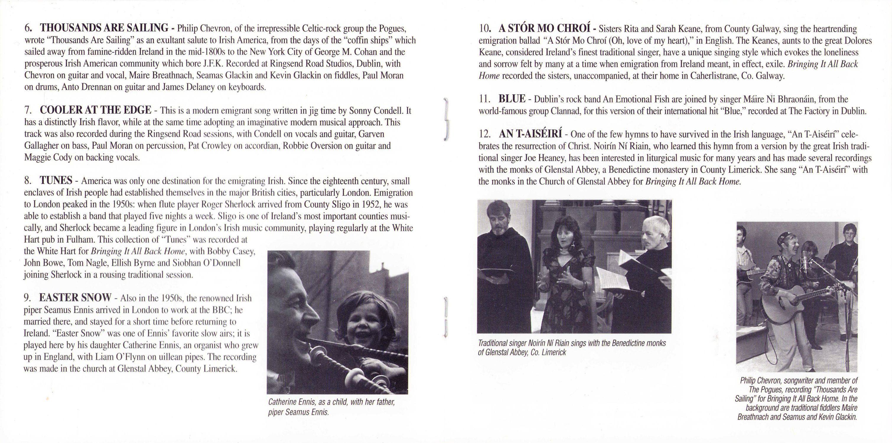 Thousands Are Sailing — Philip Chevron, of the irrepressible Celtic-rock group the Pogues, wrote "Thousands Are Sailing" as an exultant salute to Irish America, from the days of the "coffin ships" which sailed away from famine-ridden Ireland in the mid-1800s to the New York City of George M. Cohan and the prosperous Irish American community which bore J.F.K. Recorded at Ringsend Road Studios, Dublin, with Chevron on guitar and vocal, Maire Breathnach, Seamas Glackin and Kevin Glackin on fiddles, Paul Moran on drums, Anto Drennan on guitar and James Delaney on keyboards.