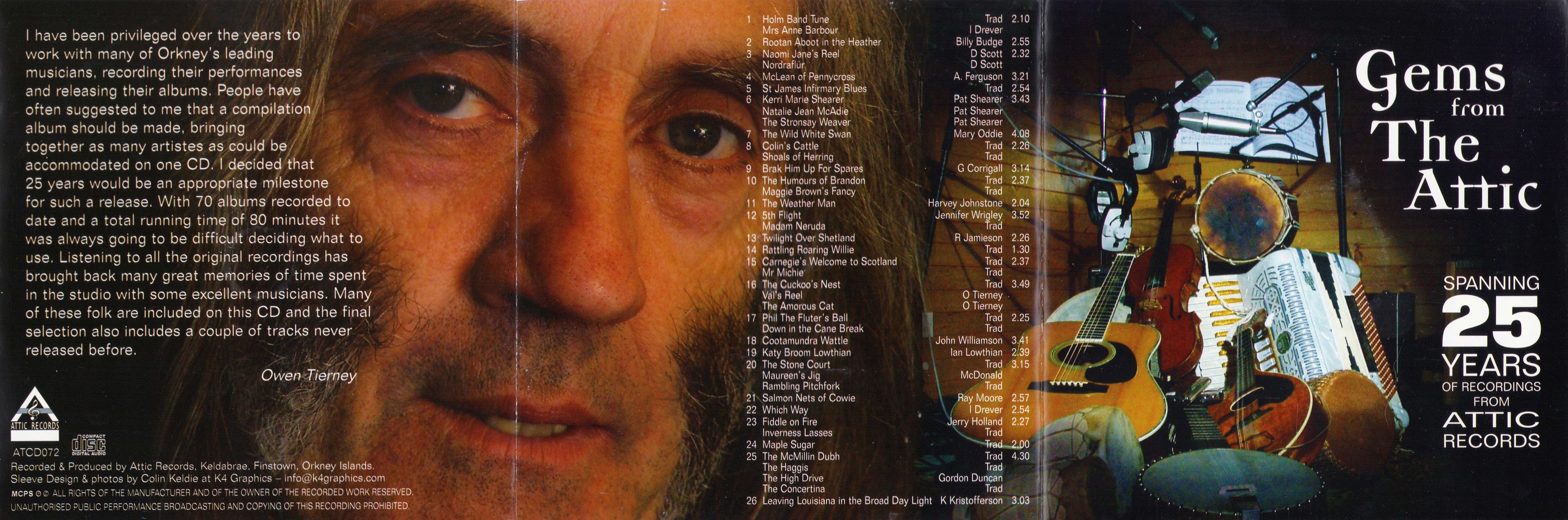 I have been privileged over the years to work with many of Orkney's leading musicians, recording their performances and releasing their albums. People have often suggested to me that a compilation album should be made, bringing together as many artistes as could be accommodated on one CD. I decided that 25 years would be an appropriate milestone for such a release. With 70 albums recorded to date and a total running time of 80 minutes it was always going to be difficult deciding what to use. Listening to all the original recordings has brought back many great memories of time spent in the studio with some excellent musicians. Many of these folk are included on this CD and the final selection also includes a couple of tracks never released before.