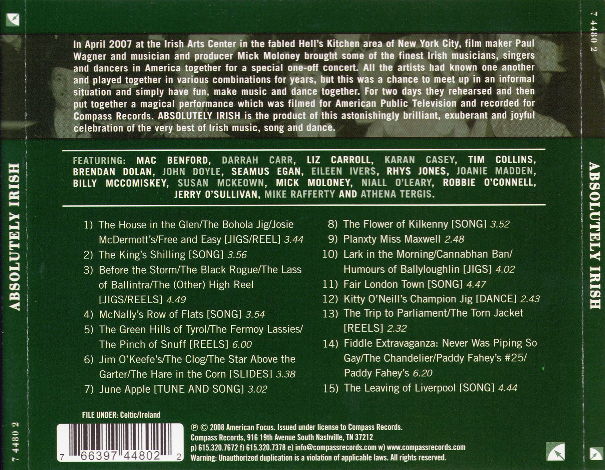 In April 2007 at the Irish Arts Center in the fabled Hell's Kitchen area of New York City, film maker Paul Wagner and musician and producer Mick Moloney brought some of the finest Irish musicians, singers and dancers in America together for a special one-off concert. All the artists had known one another and played together in various combinations for years, but this was a chance to meet up in an informal situation and simply have fun, make music and dance together. For two days they rehearsed and then put together a magical performance which was filmed for American Public Television and recorded for Compass Records. ABSOLUTELY IRISH is the product of this astonishingly brilliant, exuberant and joyful celebration of the very best of Irish music, song and dance.