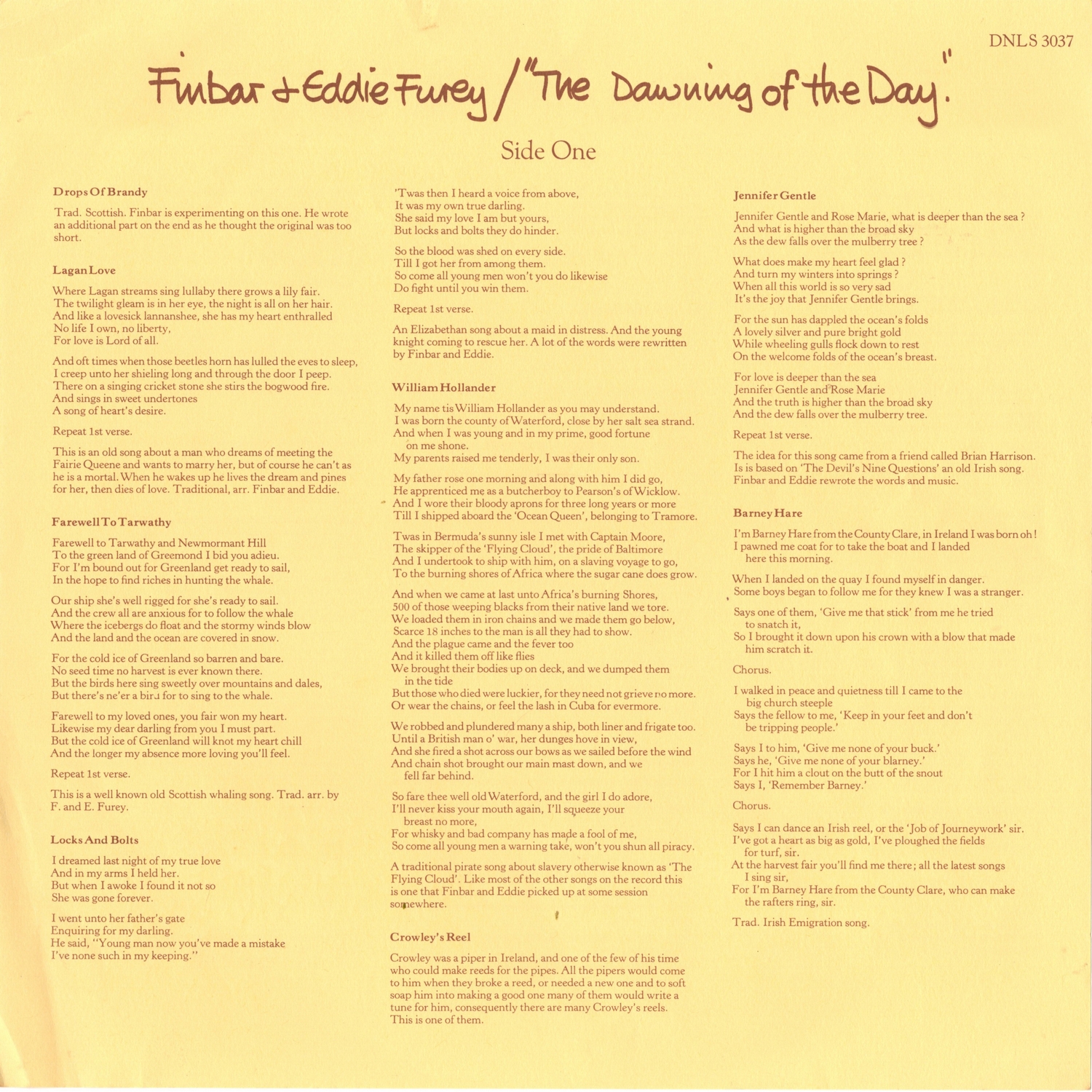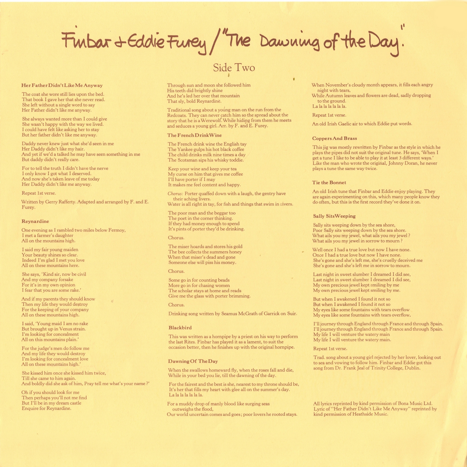 Tie the Bonnet — An old Irish tune that Finbar and Eddie enjoy playing. They are again experimenting on this, which many people know they do often, but this is the first record they've done it on.