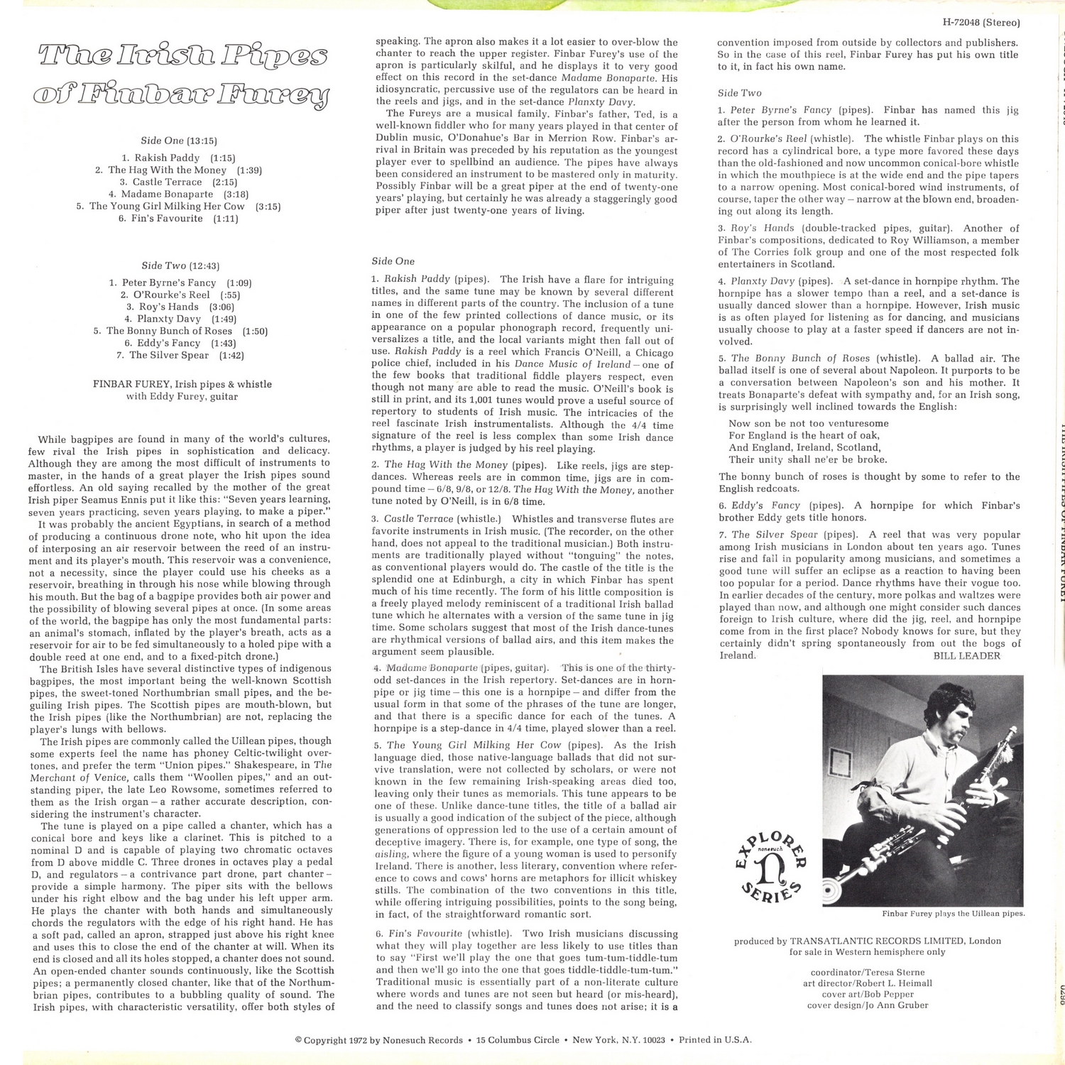 The tune is played on a pipe called a chanter, which has a conical bore and keys like a clarinet. This is pitched to a nominal D and is capable of playing two chromatic octaves from D above middle C. Three drones in octaves play a pedal D, and regulators — a contrivance part drone, part chanter — provide a simple harmony. The piper sits with the bellows under his right elbow and the bag under his left upper arm. He plays the chanter with both hands and simultaneously chords the regulators with the edge of his right hand. He has a soft pad, called an apron, strapped just above his right knee and uses this to close the end of the chanter at will. When its end is closed and all its holes stopped, a chanter does not sound. An open-ended chanter sounds continuously, like the Scottish pipes; a permanently closed chanter, like that of the Northumbrian pipes, contributes to a bubbling quality of sound. The Irish pipes, with characteristic versatility, offer both styles of speaking. The apron also makes it a lot easier to over-blow the chanter to reach the upper register. Finbar Furey's use of the apron is particularly skilful, and he displays it to very good effect on this record in the set-dance Madame Bonaparte. His idiosyncratic, percussive use of the regulators can be heard in the reels and jigs, and in the set-dance Planxty Davy.