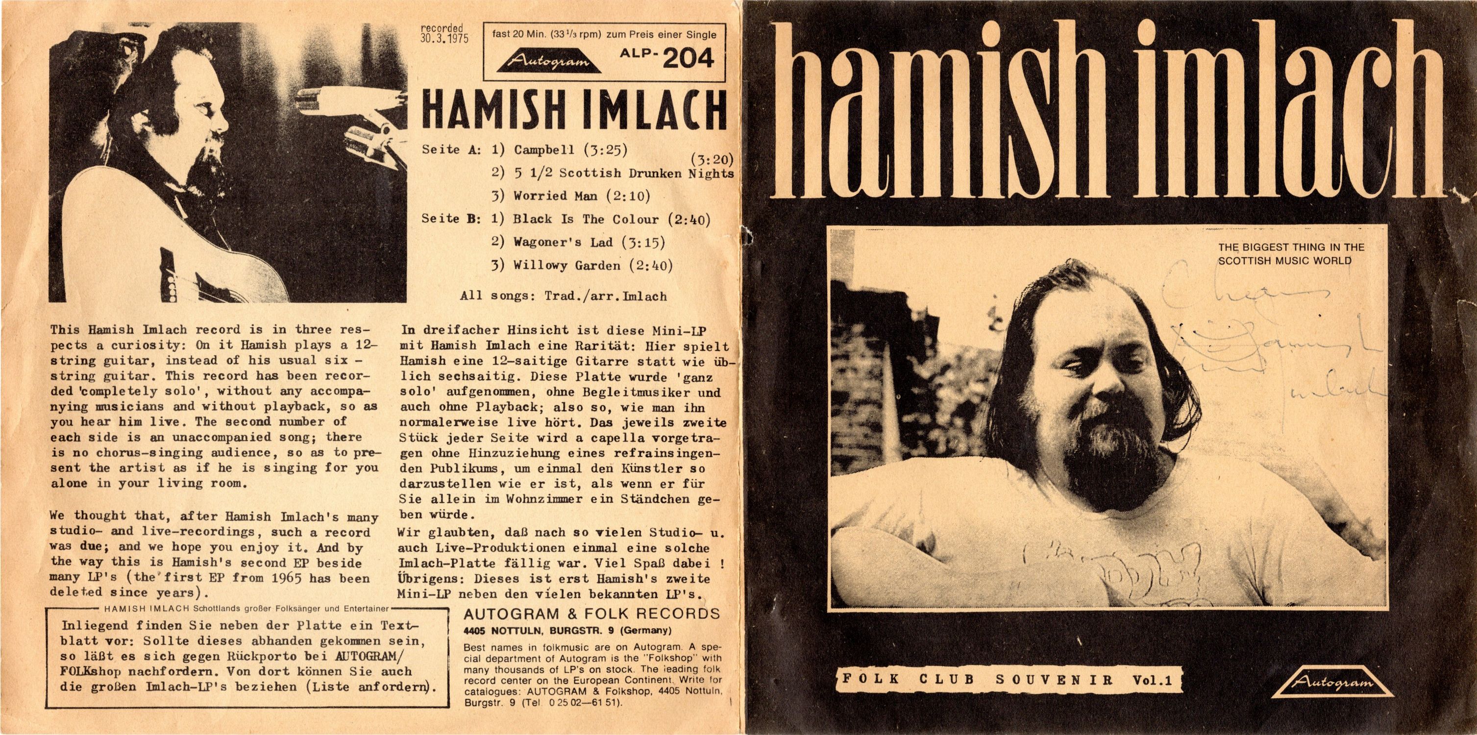 We thought that, after Hamish Imlach's many studio — and live — recordings, such a record was due; and we hope you enjoy it. And by the way this Hamish's second EP beside many LP's (the first EP from 1965 has been deleted since years).
