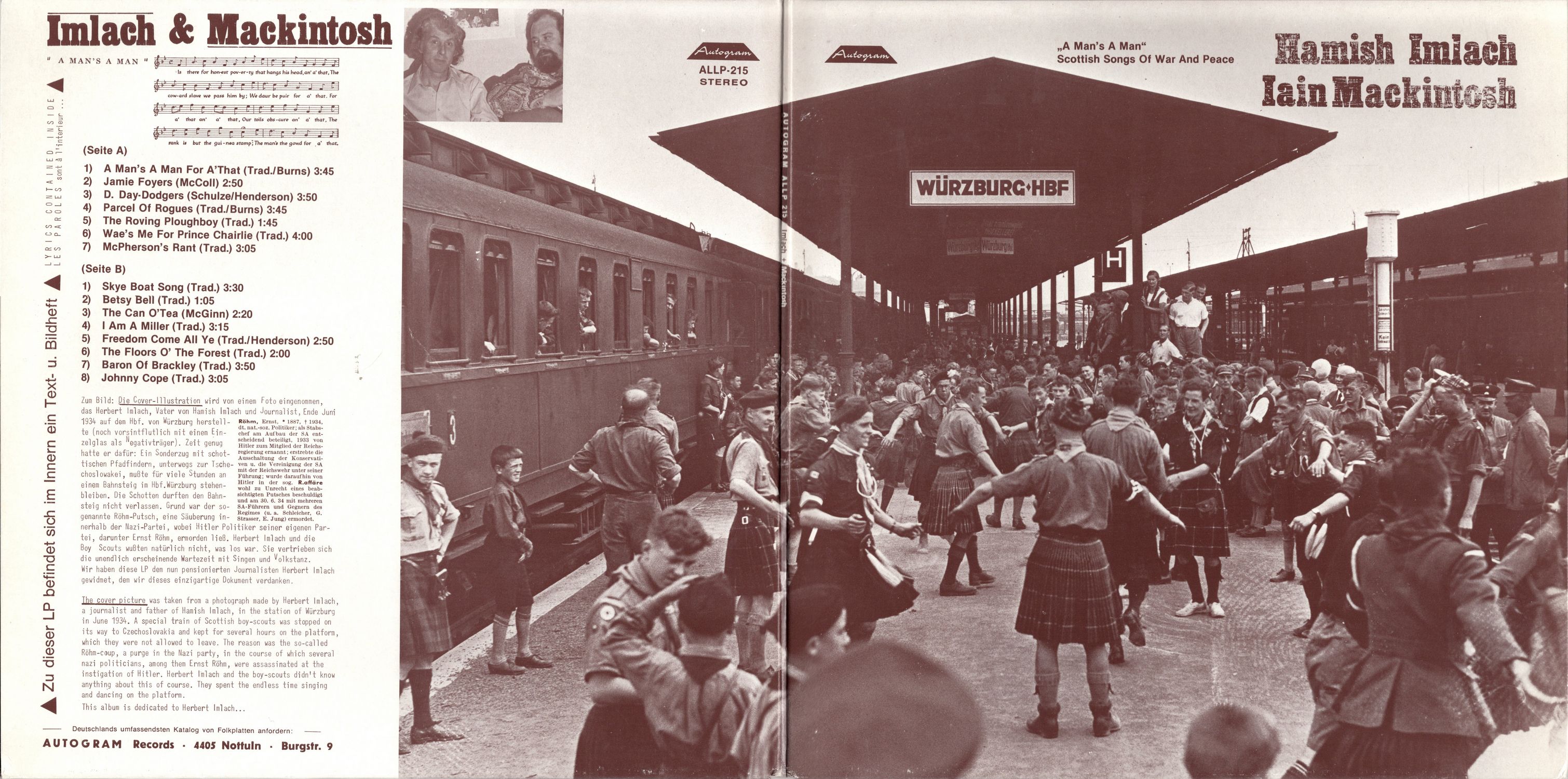 The cover picture was taken from a photograph made by Herbert Imlach, a journalist and father of Hamish Imlach, in the station of Würzburg in June 1934. A special train of Scottish boy-scouts was stopped on its way to Czechoslovakia and kept for several hours on the platform, which they were not allowed to leave. The reason was the so-called Röhm-coup, a purge in the Nazi party, in the course of which several nazi politicians, among them Ernst Röhm, were assassinated at the instigation of Hitler. Herbert Imlach and the boy-scouts didn't know anything about this of course. They spent the endless time singing and dancing on the platform.
