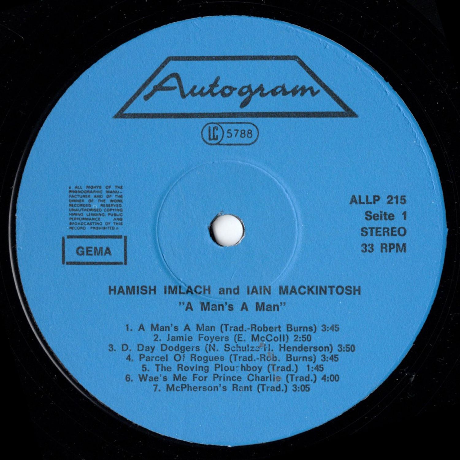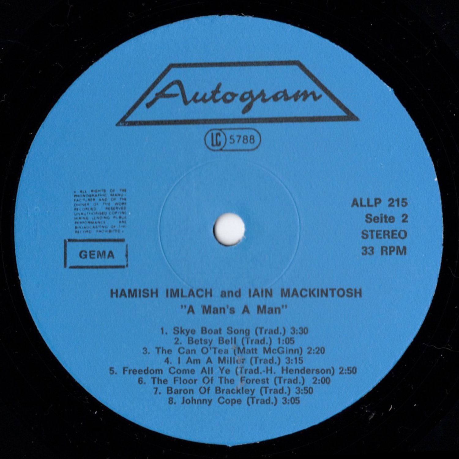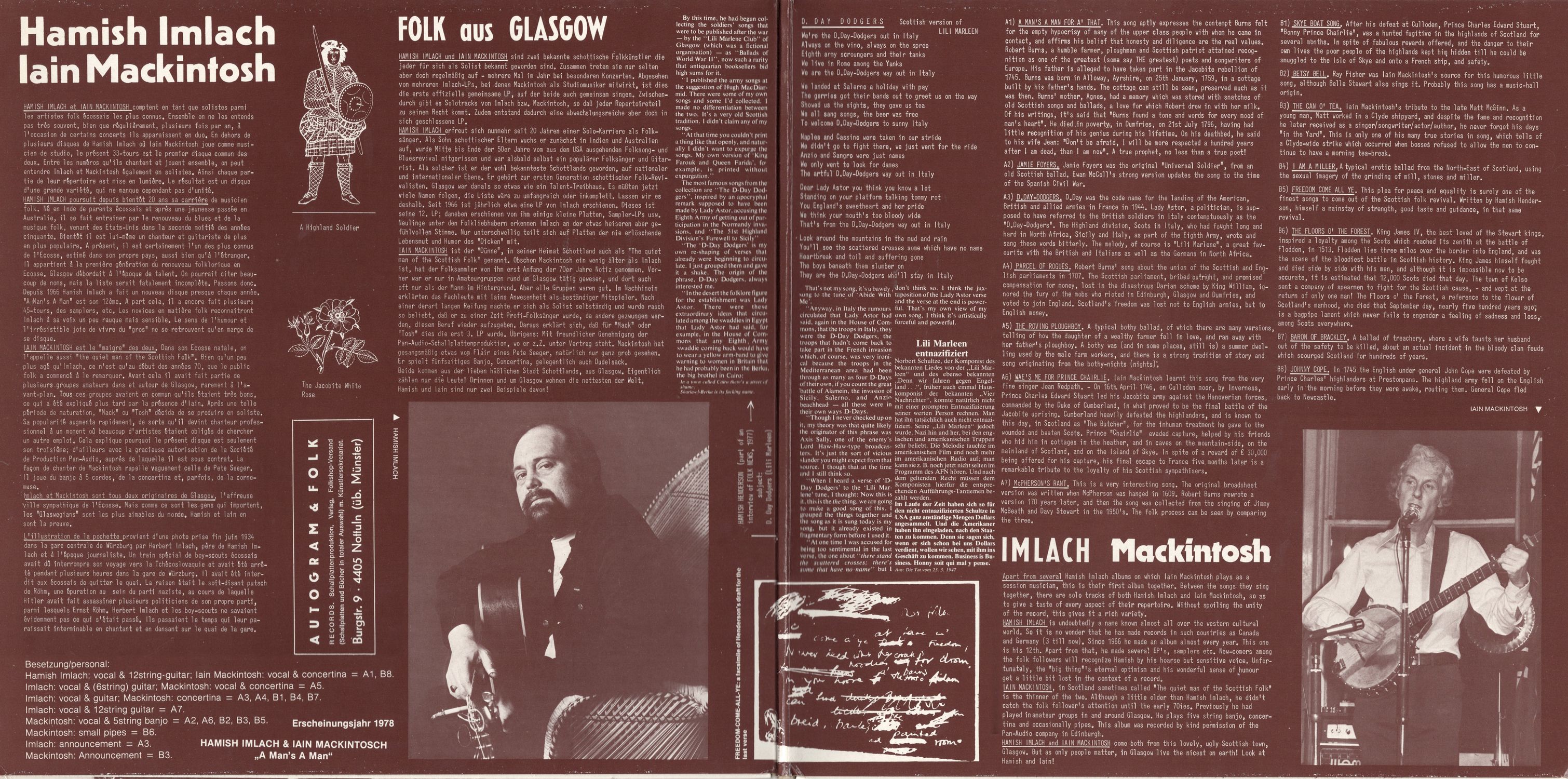 IAIN MACKINTOSH, in Scotland sometimes called "The quiet man of the Scottish Folk" is the thinner of the two. Although a little older than Hamish Imlach, he didn't catch the folk follower's attention until the early 70's. Previously he had played in amateur groups in and around Glasgow. He plays five string banjo, concertina and occasionally pipes. This album was recorded by kind permission of the Pan-Audio company in Edinburgh.
