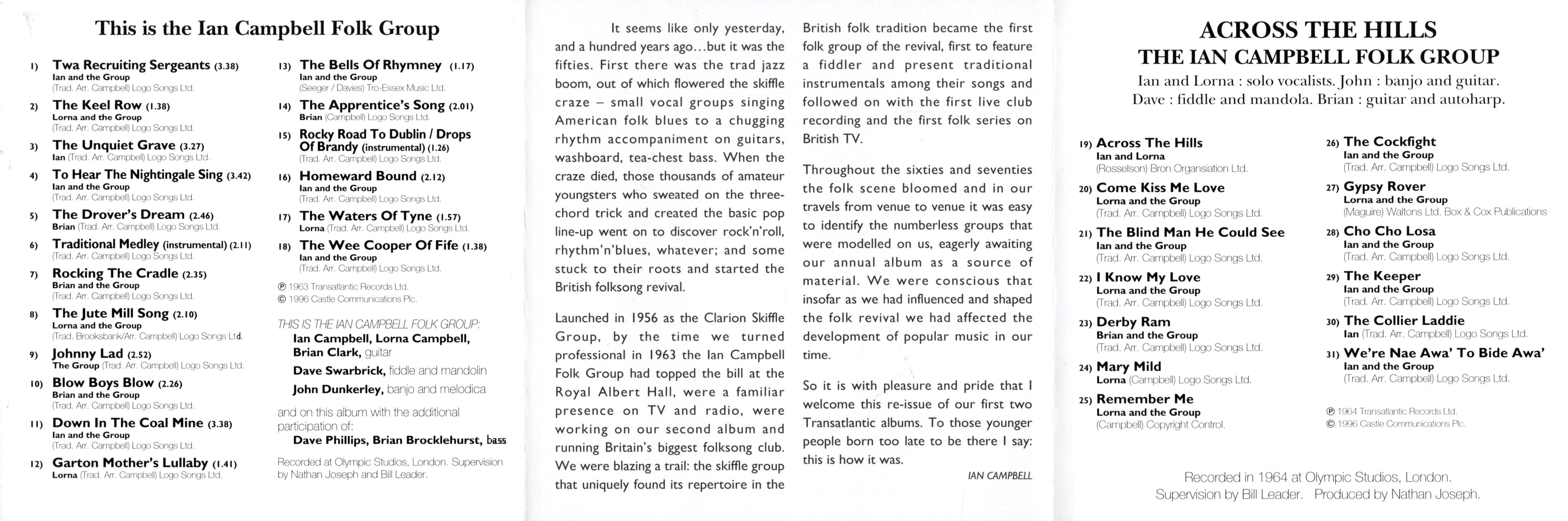 In retrospect, these and the later albums they made for Transatlantic were enormously influential on the new generation of singers and players who came through the folk revival of the sixties, many performers using the Campbells' versions of rediscovered traditional songs. The original line-up of the Ian Campbell Folk Group included fiddler Dave Swarbrick, later to become one of the driving forces in Fairport Convention. This the first time these two LP's, originally released in 1963 and 1964, have been re-issued on CD.