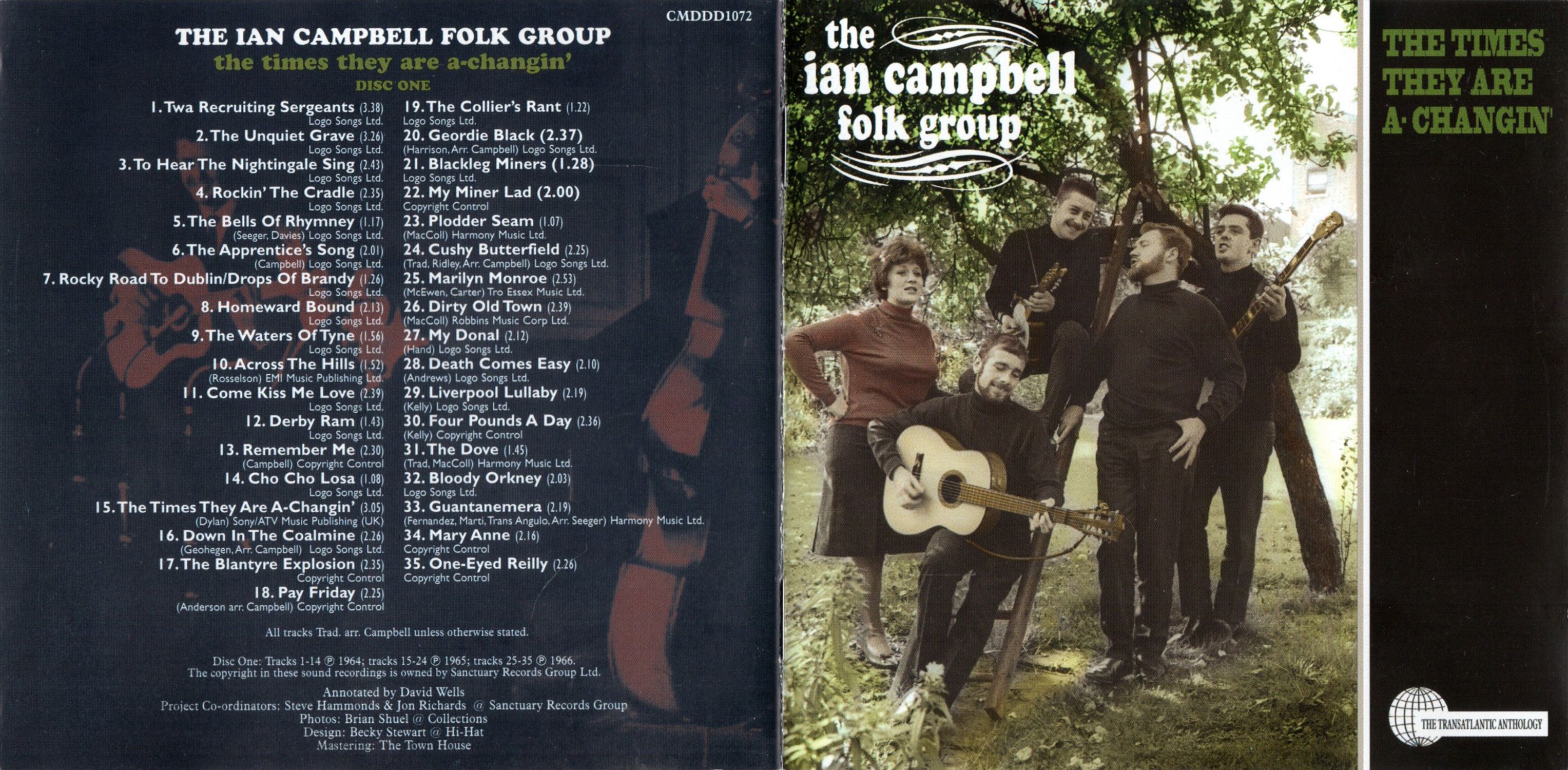 It was to be the next release, however, that brought the Ian Campbell Folk Group to their widest audience yet. Albums like The Freewheelin' Bob Dylan and Another Side Of Bob Dylan had introduced a callow youth with a voice like sand and glue to folkies on both sides of the Atlantic, but as yet he had failed to move beyond the folk fanatics to embrace across-the-board pop stardom. Thus it was that the Campbells recorded a version of his call-to-arms, 'The Times They Are A-Changin", that the canny Nat Joseph released as a stand-alone single at the beginning of March 1965. Alleged to be the first non-US cover of Dylan material, it was certainly the first of his songs to reach the British singles chart, spending five weeks in the listings despite climbing no higher than the No 42 position. Sadly its progress was halted when CBS, noting Transatlantic's success with a year-old song, retaliated by issuing the original version in 45rpm format. It duly reached the British Top Ten, to become the first in a run of nine consecutive UK hit singles for Dylan over the next fifteen months. Perhaps without that initial, Campbell-inspired prod, CBS would never have viewed him as a singles act …