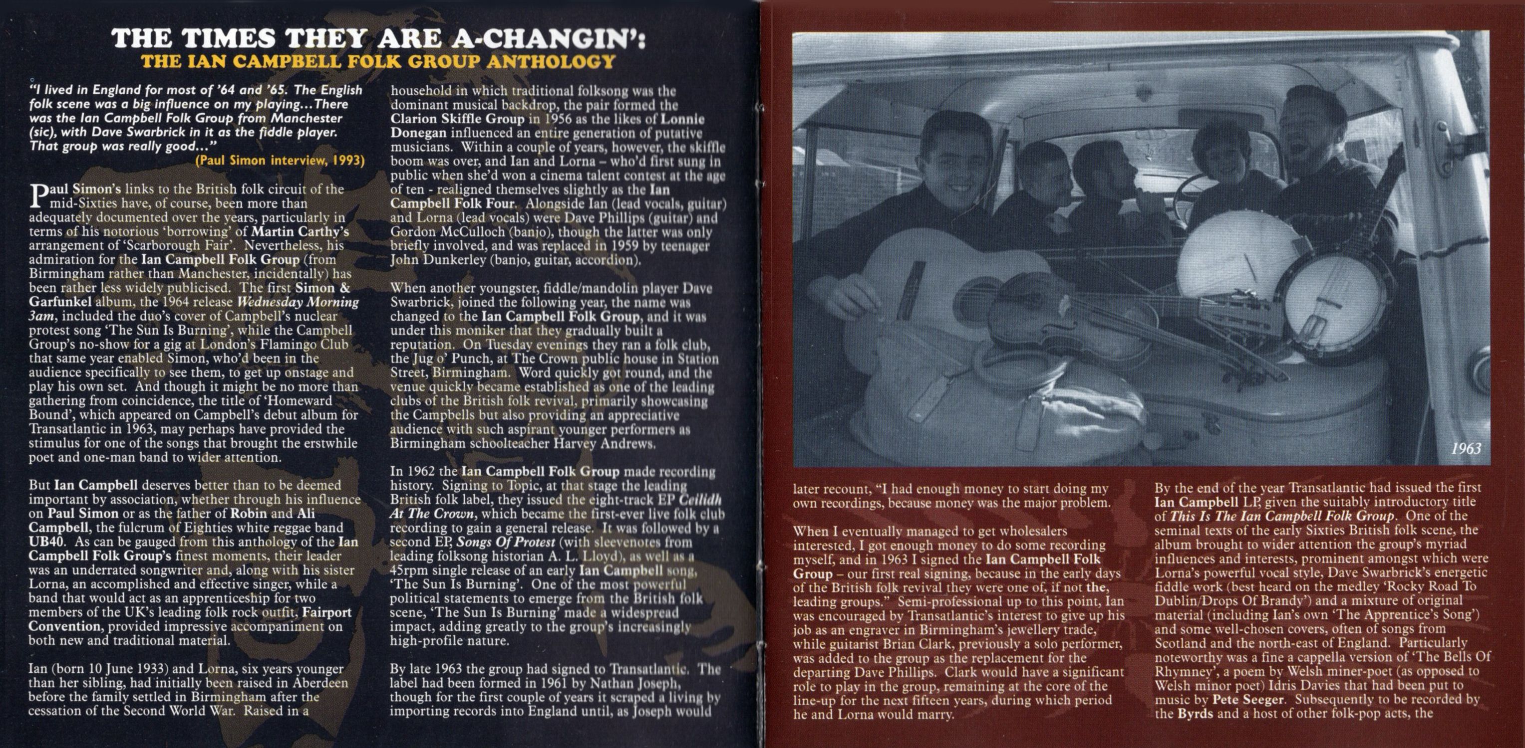 Paul Simon's links to the British folk circuit of the mid-Sixties have, of course, been more than adequately documented over the years, particularly in terms of his notorious 'borrowing' of Martin Carthy's arrangement of 'Scarborough Fair'. Nevertheless, his admiration for the Ian Campbell Folk Group (from Birmingham rather than Manchester, incidentally) has been rather less widely publicised. The first Simon & Garfunkel album, the 1964 release Wednesday Morning 3am, included the duo's cover of Campbell's nuclear protest song 'The Sun Is Burning', while the Campbell Group's no-show for a gig at London's Flamingo Club that same year enabled Simon, who'd been in the audience specifically to see them, to get up onstage and play his own set. And though it might be no more than gathering from coincidence, the title of 'Homeward Bound', which appeared on Campbell's debut album for Transatlantic in 1963, may perhaps have provided the stimulus for one of the songs that brought the erstwhile poet and one-man band to wider attention.