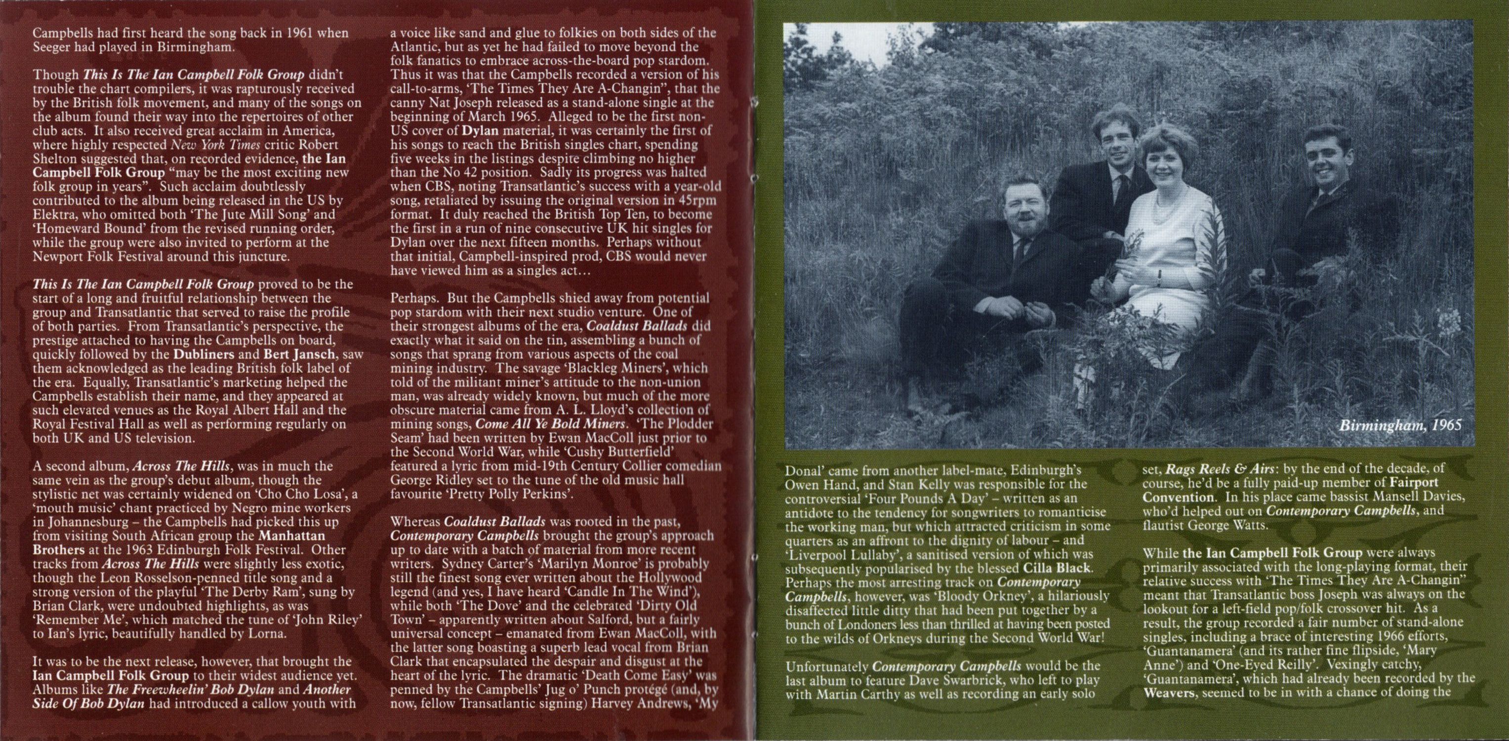 When I eventually managed to get wholesalers interested, I got enough money to do some recording myself, and in 1963 I signed the Ian Campbell Folk Group — our first real signing, because in the early days of the British folk revival they were one of, if not the, leading groups." Semi-professional up to this point, Ian was encouraged by Transatlantic's interest to give up his job as an engraver in Birmingham's jewellery trade, while guitarist Brian Clark, previously a solo performer, was added to the group as the replacement for the departing Dave Phillips. Clark would have a significant role to play in the group, remaining at the core of the line-up for the next fifteen years, during which period he and Lorna would marry.