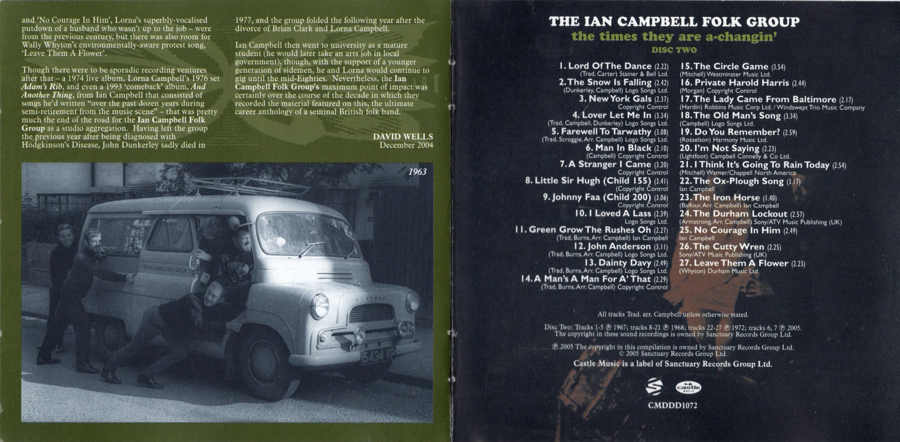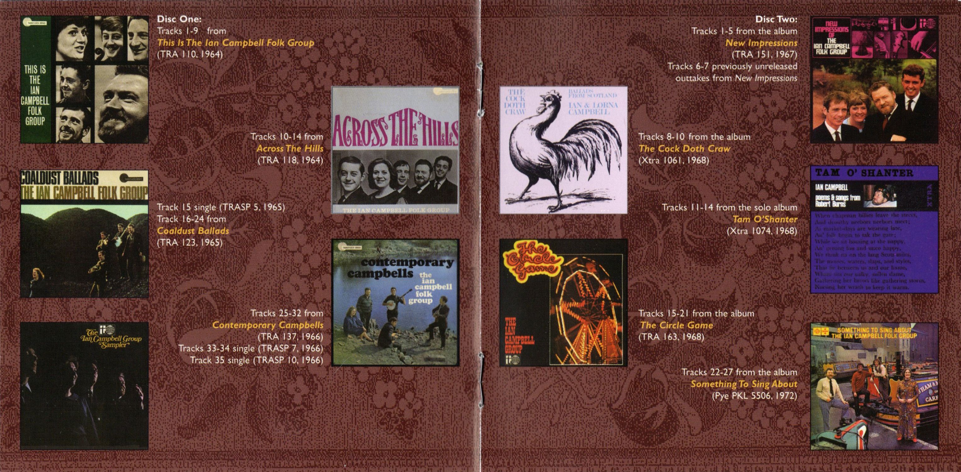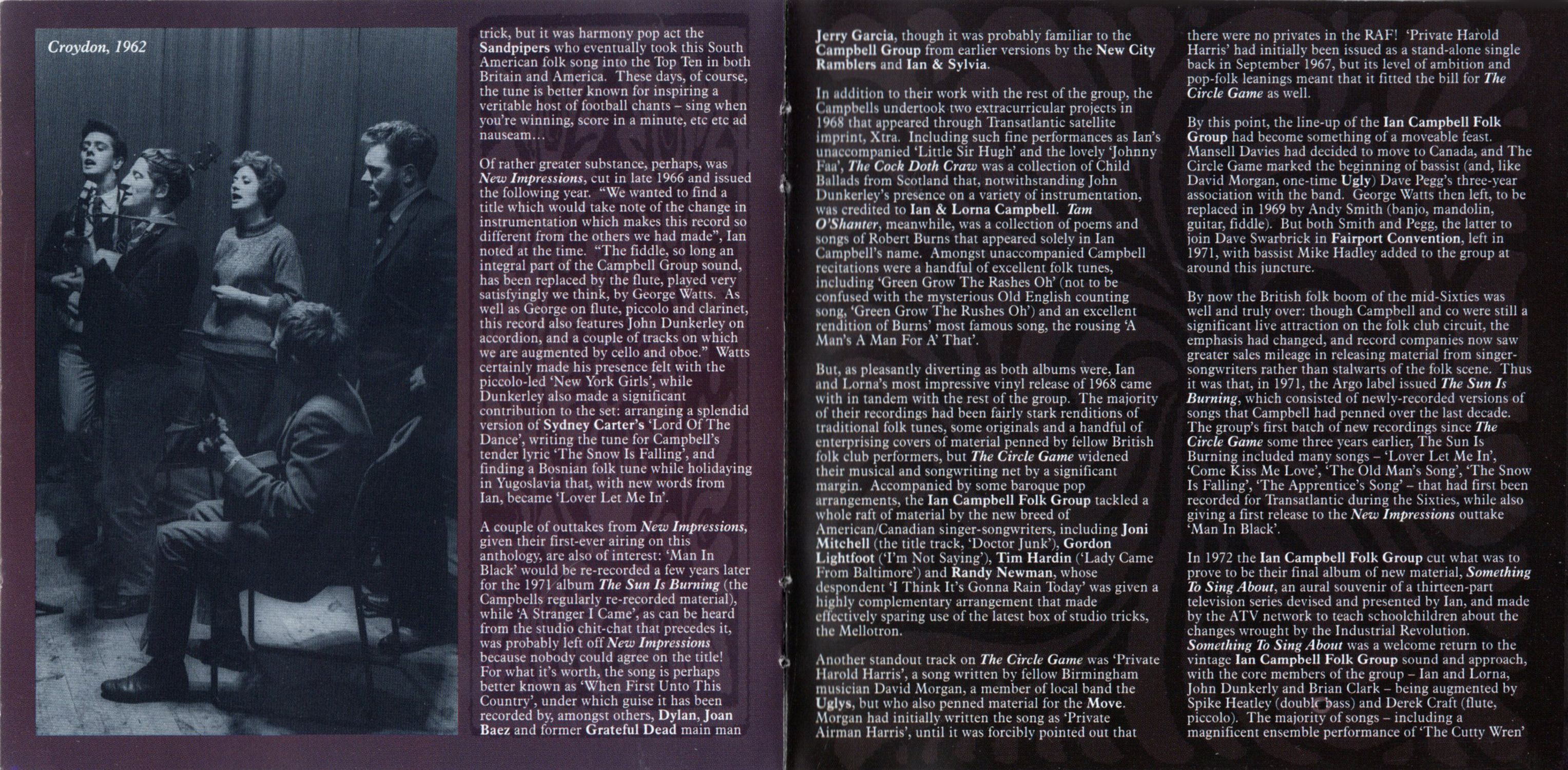 A couple of outtakes from New Impressions, given their first-ever airing on this anthology, are also of interest: 'Man In Black' would be re-recorded a few years later for the 1971 album The Sun Is Burning (the Campbells regularly re-recorded material), while 'A Stranger I Came', as can be heard from the studio chit-chat that precedes it, was probably left off New Impressions because nobody could agree on the title! For what it's worth, the song is perhaps better known as 'When First Unto This Country', under which guise it has been recorded by, amongst others, Dylan, Joan Baez and former Grateful Dead main man Jerry Garcia, though it was probably familiar to the Campbell Group from earlier versions by the New City Ramblers and Ian & Sylvia.