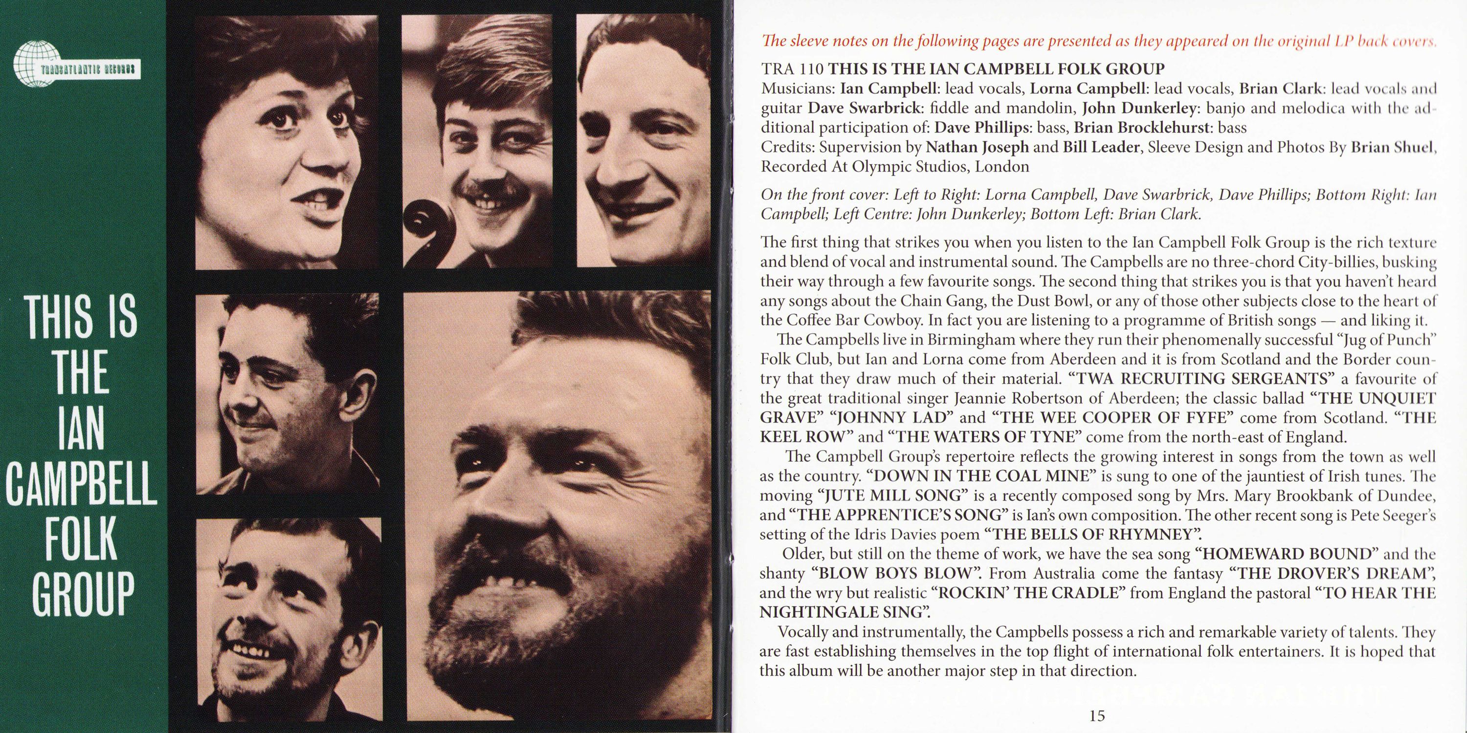 Campbell and his band were one of the many acts to appear on the aspiring Edinburgh Folk Festival albums, a project organised by future Transatlantic men Nat Joseph and Bill Leader. Nat, in particular, was impressed by the group and their socially conscious approach, signing them up as the label's flagship folk act and in 1963 they released their first album, This is the Ian Campbell Folk Group. Lorna's husband, Brian Clark joined the group for this album on guitar and vocals and remained a member until 1978. Later the same year Dave Phillips left the band.