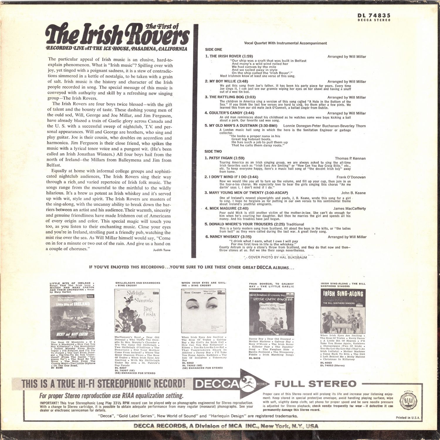 The particular appeal of Irish music is an elusive, hard-to-explain phenomenon. What is "Irish music"? Spilling over with joy, yet tinged with a poignant sadness, it is a stew of contradictions simmered in a kettle of nostalgia, to be taken with a grain of salt. Irish music is the history and character of the Irish people recorded in song. The special message of this music is conveyed with authority and skill by a refreshing new singing group—The Irish Rovers.