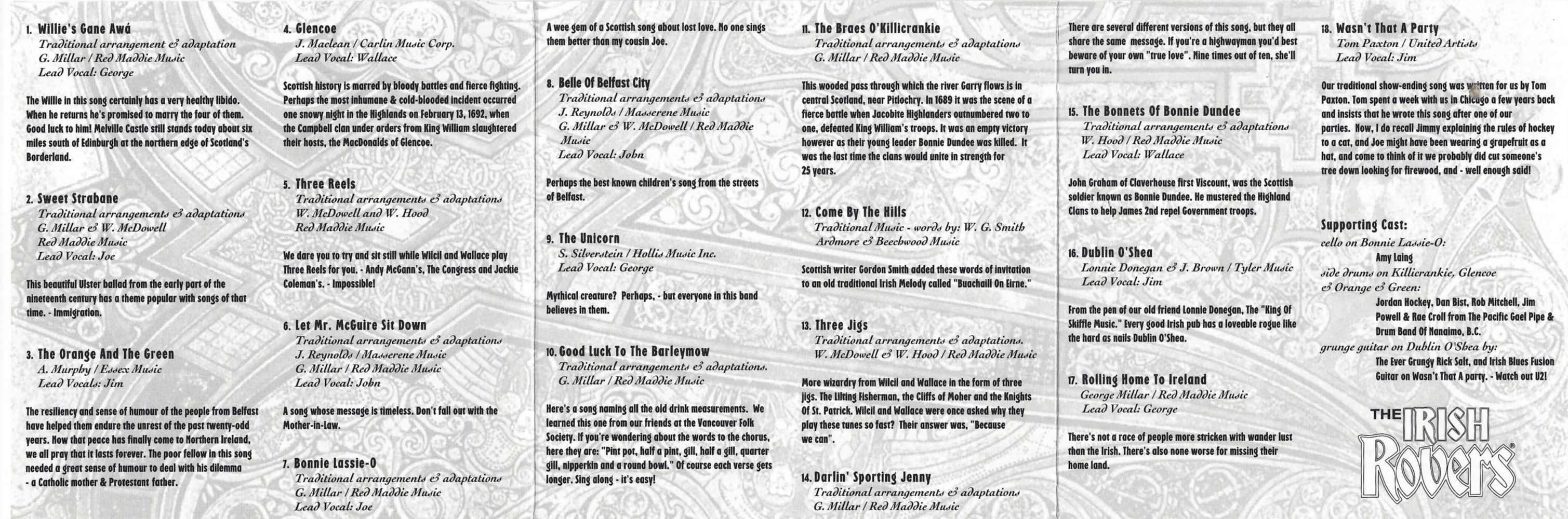 We thank all our fans for their thirty years of listening. Without you there would have been no Irish Rovers. We hope you enjoy these new tracks, the beginning of our next 30 years.