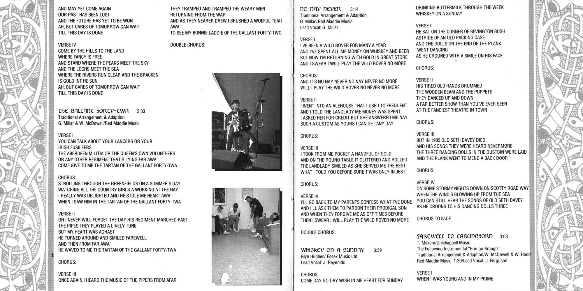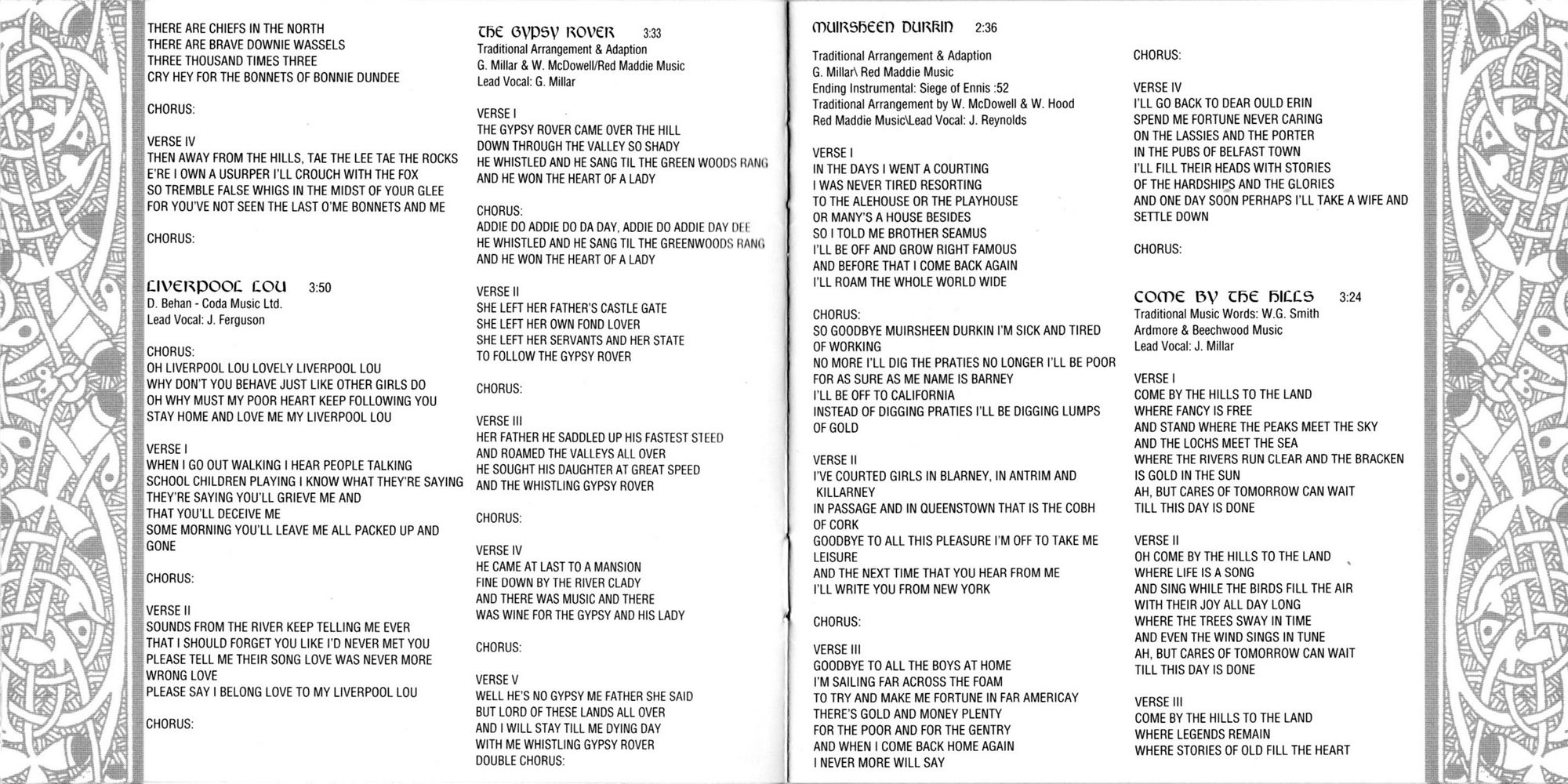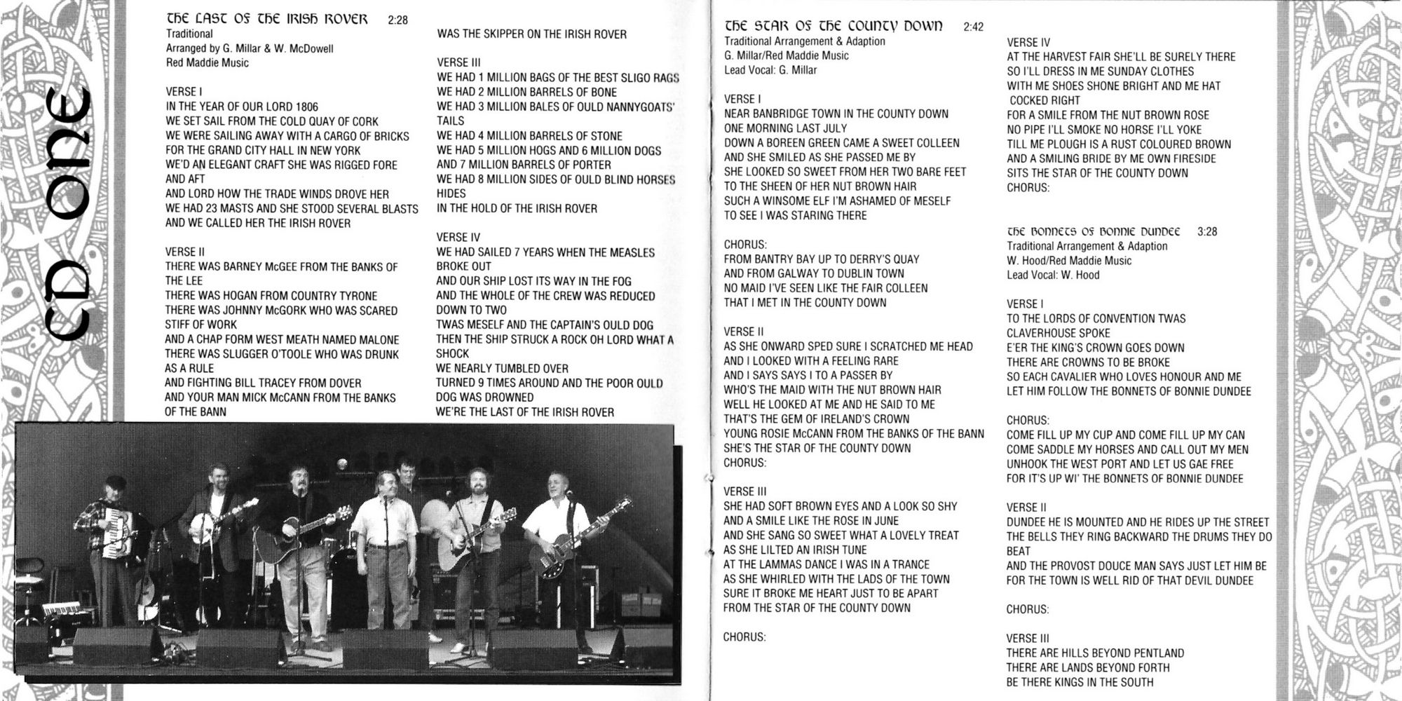 One evening last spring we sat down together to listen to our old albums with the purpose of releasing 12 tracks for a "best of" disk of our hard to find songs. After a laugh or two over the "Donald Duck" tone of our young voices, we realized there were some great songs that we had forgotten all about. As someone said that night, "there's a bunch of gems there." The more we listened to the old versions, the more new ideas for arrangements and instrumentation emerged. The real problem was about to start — how to get a group of Irishmen to agree to any thing, never mind selecting 12 songs out of approximately 300. After a few "civil" discussions and not so few Guinnesses, we managed to pick 32 of our favourites, at which point everyone refused to participate in the elimination of any more songs, out of love and respect for the material and the fact that the Guinness was now gone. Well, to end this artistic and cultural evening we not only decided on 32 tracks, we also decided to re-record them. We hope you get as much pleasure out of listening to these songs as we did redoing them. They've brought back many happy memories for us and hopefully they'll do the same for you. Enjoy.