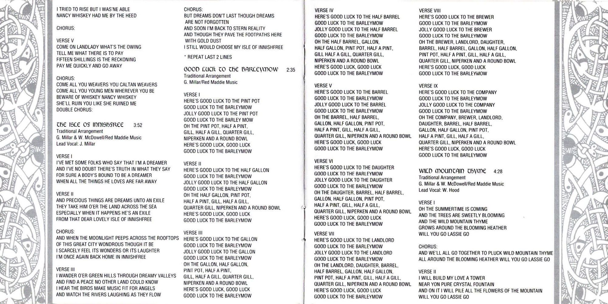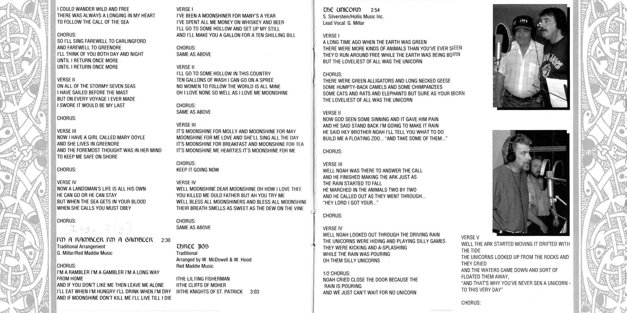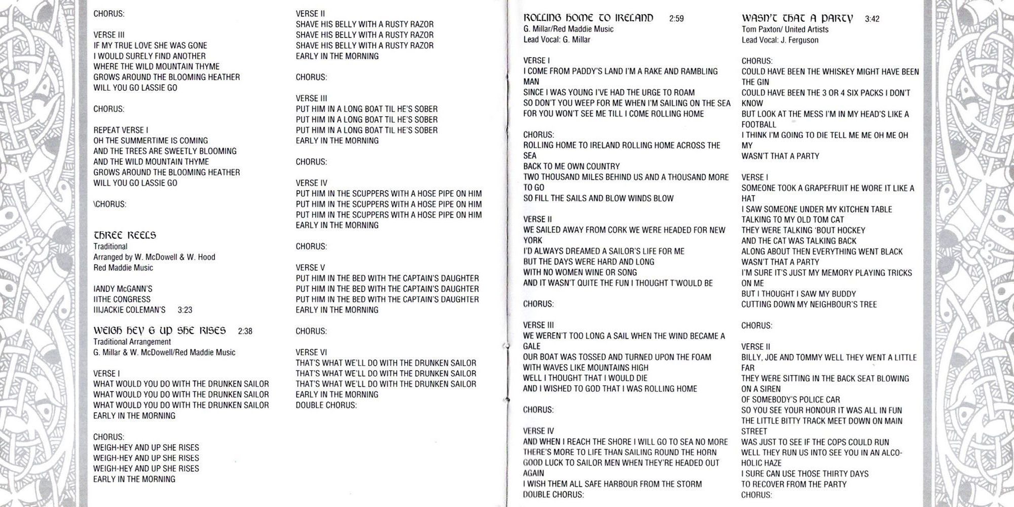 One evening last spring we sat down together to listen to our old albums with the purpose of releasing 12 tracks for a "best of" disk of our hard to find songs. After a laugh or two over the "Donald Duck" tone of our young voices, we realized there were some great songs that we had forgotten all about. As someone said that night, "there's a bunch of gems there." The more we listened to the old versions, the more new ideas for arrangements and instrumentation emerged. The real problem was about to start — how to get a group of Irishmen to agree to any thing, never mind selecting 12 songs out of approximately 300. After a few "civil" discussions and not so few Guinnesses, we managed to pick 32 of our favourites, at which point everyone refused to participate in the elimination of any more songs, out of love and respect for the material and the fact that the Guinness was now gone. Well, to end this artistic and cultural evening we not only decided on 32 tracks, we also decided to re-record them. We hope you get as much pleasure out of listening to these songs as we did redoing them. They've brought back many happy memories for us and hopefully they'll do the same for you. Enjoy.