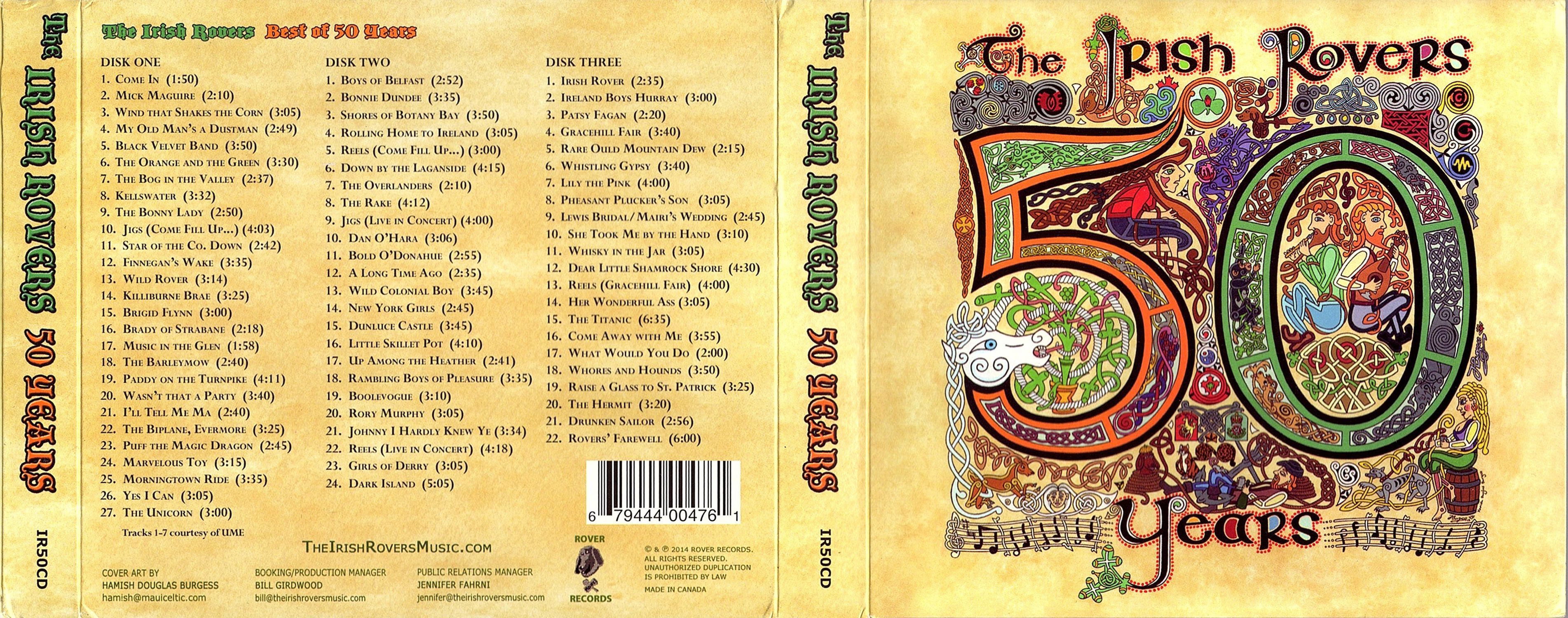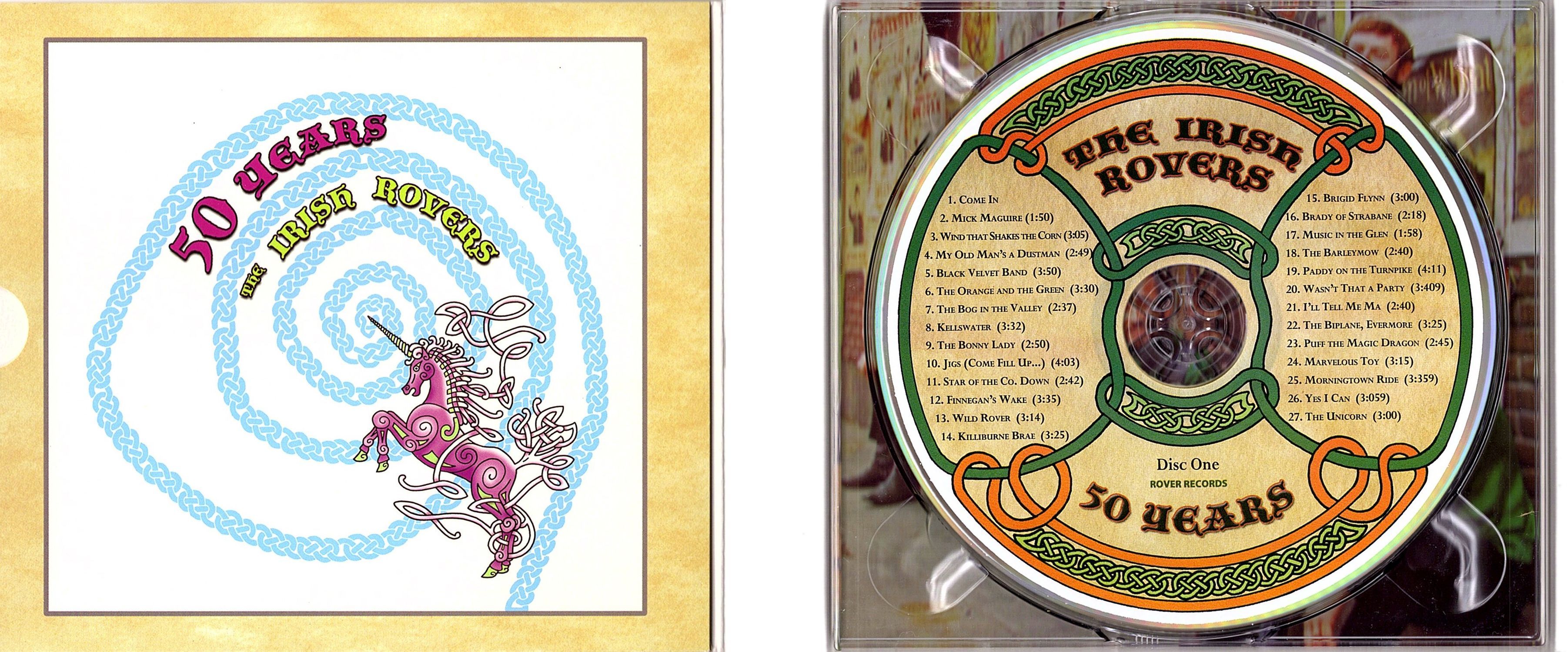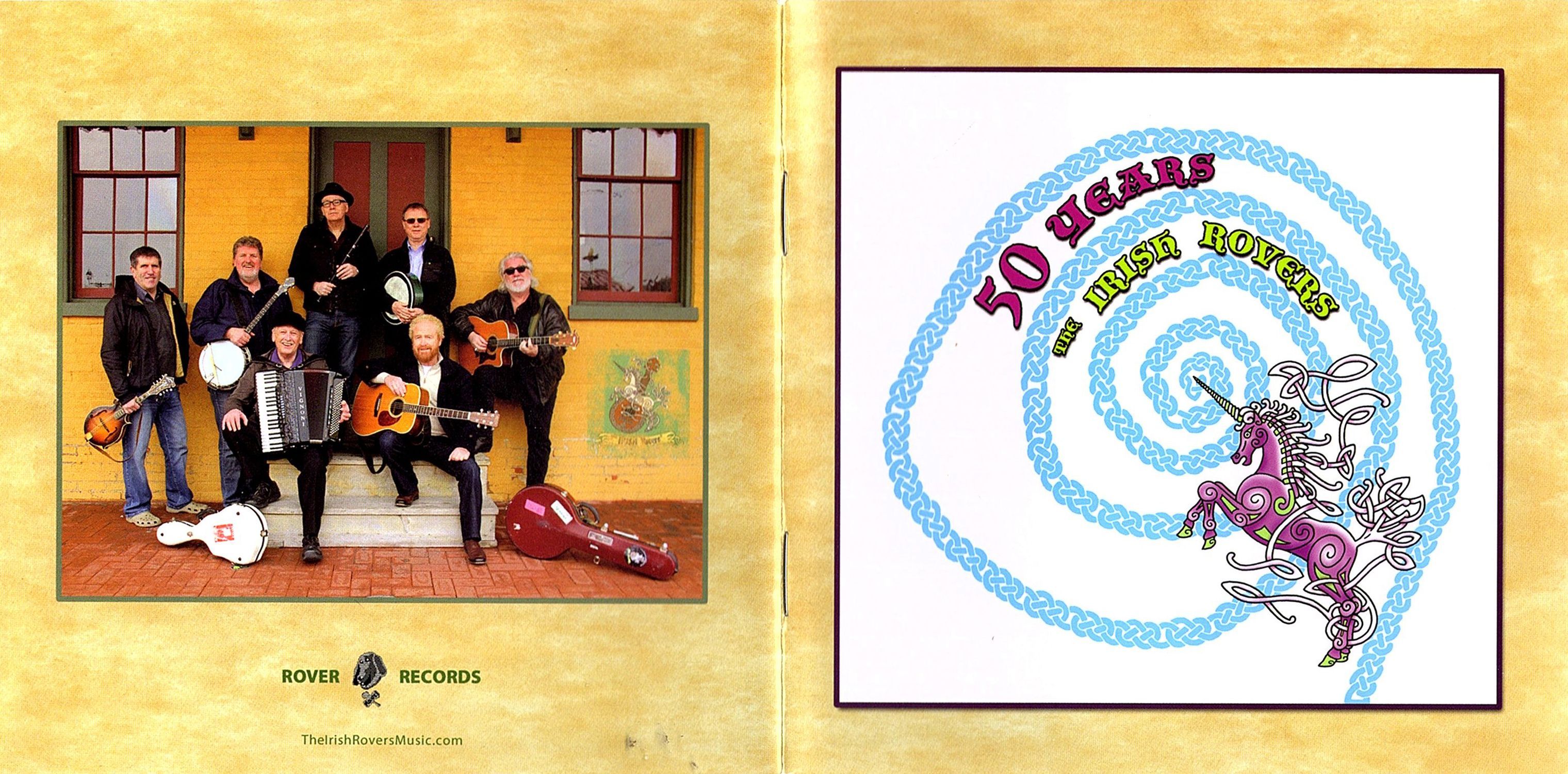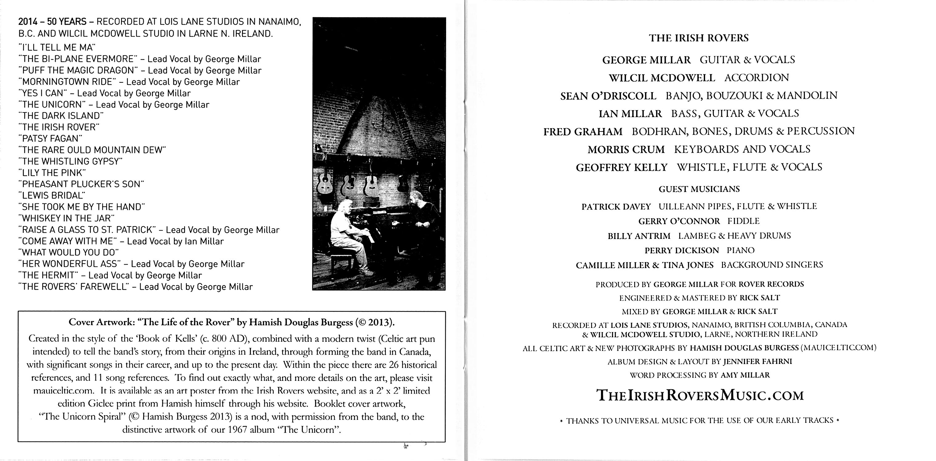 Created in the style of the 'Book of Kells' (c. 800 ad), combined with a modern twist (Celtic art pun intended) to tell the band's story, from their origins in ireland, through forming the band in canada, with significant songs in their career, and up to the present day. Within the piece there are 26 historical references, and 11 song references. To find out exactly what, and more details on the art, please visit mauiceltic.Com. It is available as an art poster from the irish rovers website, and as a 2' x 2' limited edition giclee print from hamish himself through his website. Booklet cover artwork, "The Unicorn Spiral" (© Hamish Burgess 2013) is a nod, with permission from the band, to the distinctive artwork of our 1967 Album "The Unicorn".