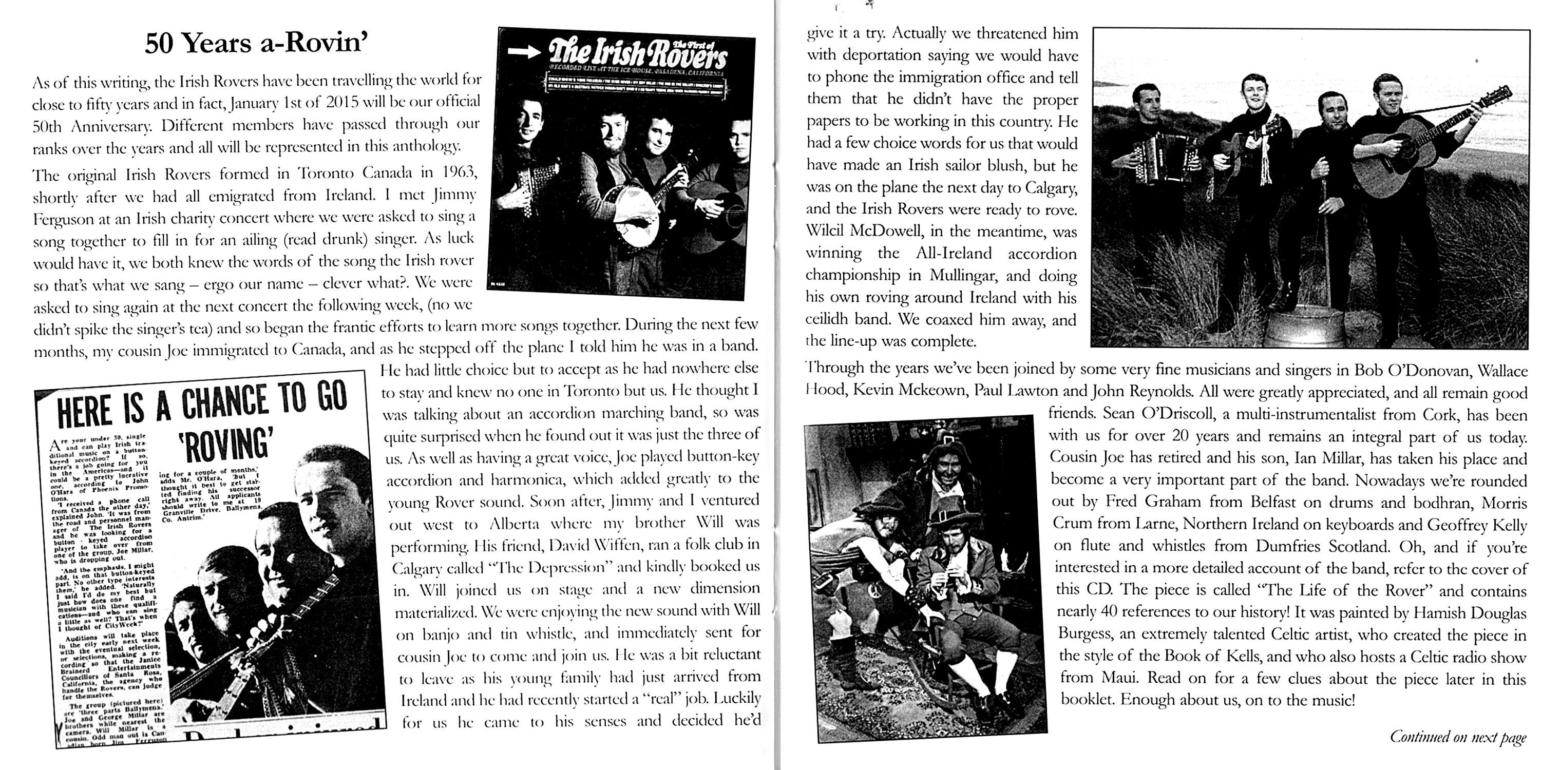 As of this writing, the Irish Rovers have been travelling the world for close to fifty years and in fact, January 1st of 2015 will be our official 50th Anniversary. Different members have passed through our ranks over the years and all will be represented in this anthology.