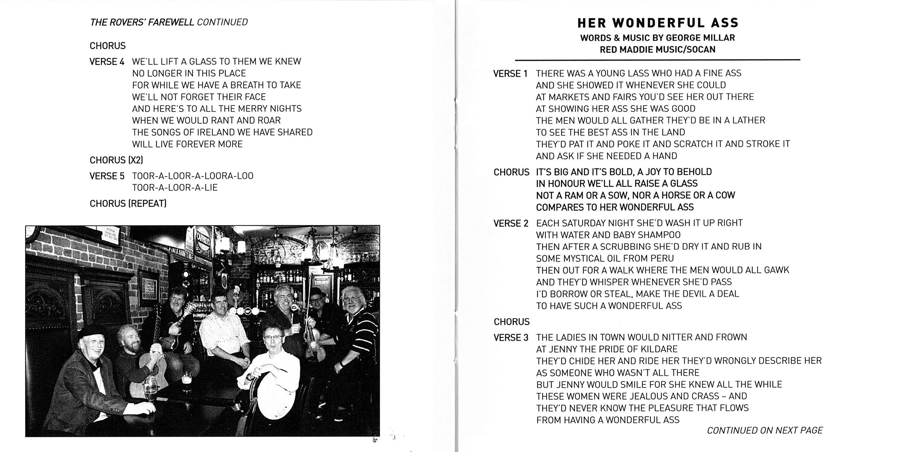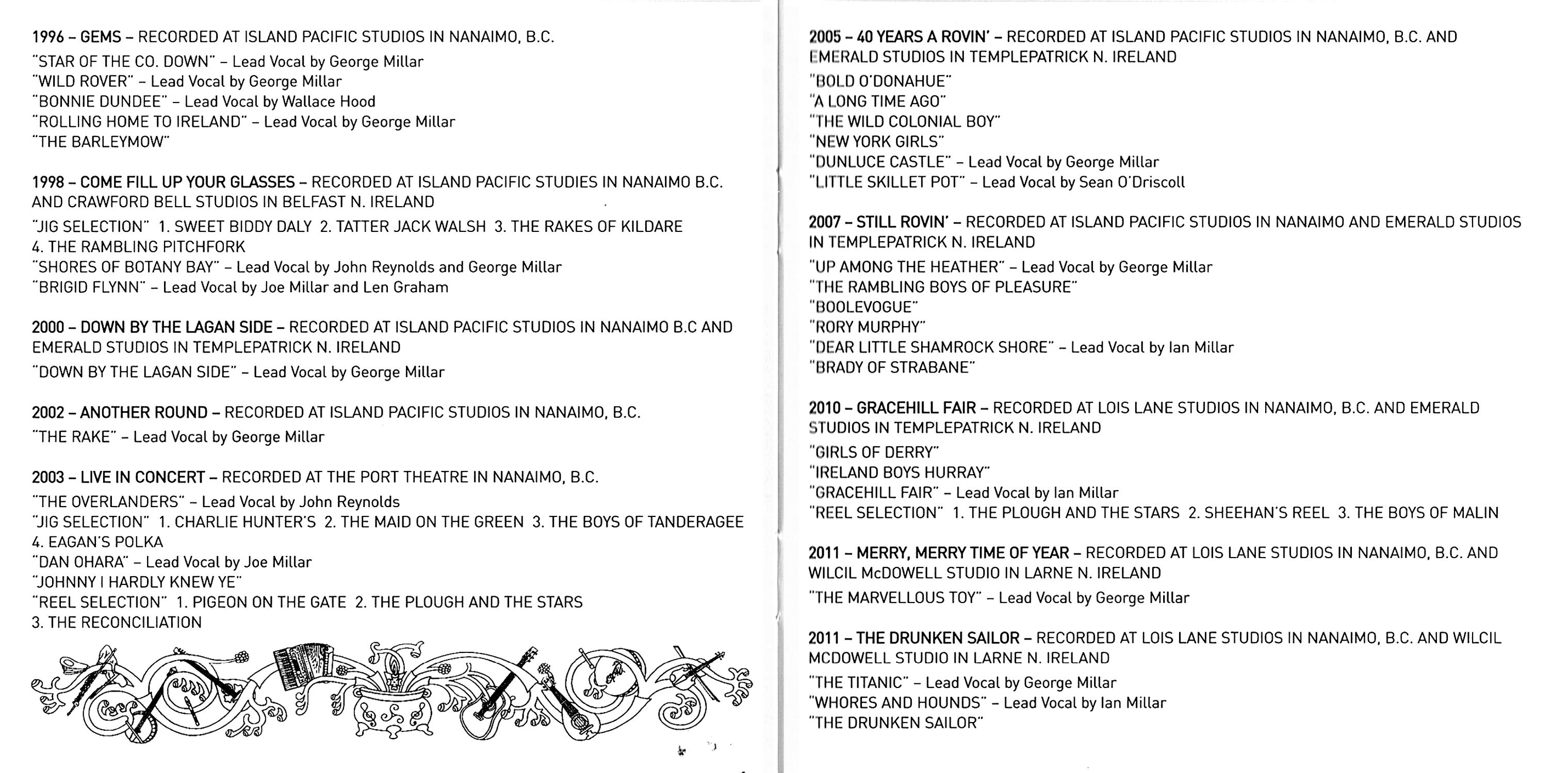 Through the years we've been joined by some very fine musicians and singers in Bob O'Donovan, Wallace Hood, Kevin McKeown, Paul Lawton and John Reynolds. All were greatly appreciated, and all remain good friends. Seán O'Driscoll, a multi-instrumentalist from Cork, has been with us for over 20 years and remains an integral part of us today. Cousin Joe has retired and his son, Ian Millar, has taken his place and become a very important part of the band. Nowadays we're rounded out by Fred Graham from Belfast on drums and bodhran, Morris Crum from Larne, Northern Ireland on keyboards and Geoffrey Kelly on flute and whistles from Dumfries Scotland. Oh, and if you're interested in a more detailed account of the band, refer to the cover of this CD. The piece is called "The Life of the Rover" and contains nearly 40 references to our history! It was painted by Hamish Douglas Burgess, an extremely talented Celtic artist, who created the piece in the style of the Book of Kells, and who also hosts a Celtic radio show from Maui. Read on for a few clues about the piece later in this booklet. Enough about us, on to the music!