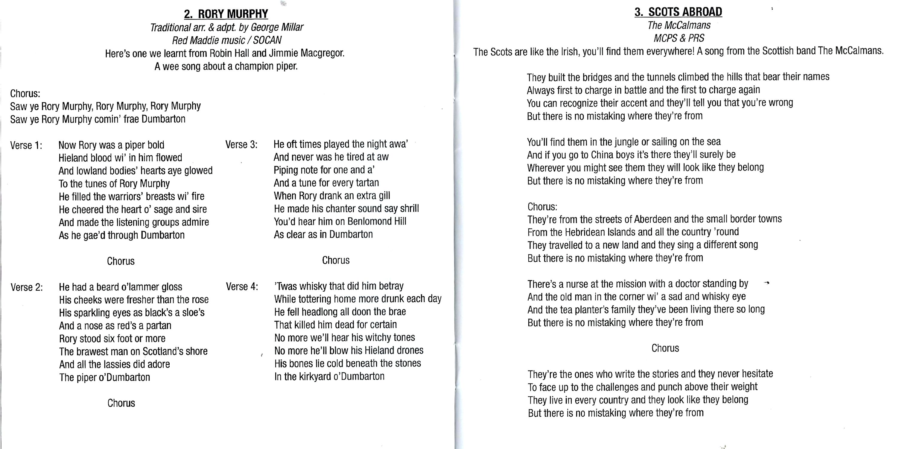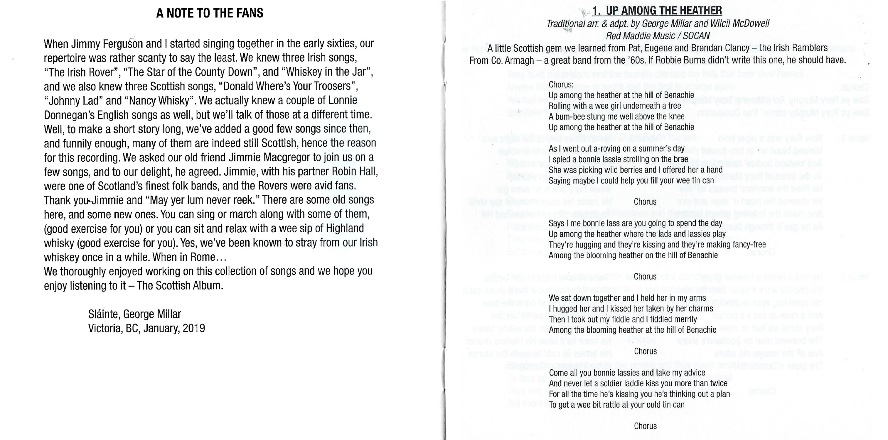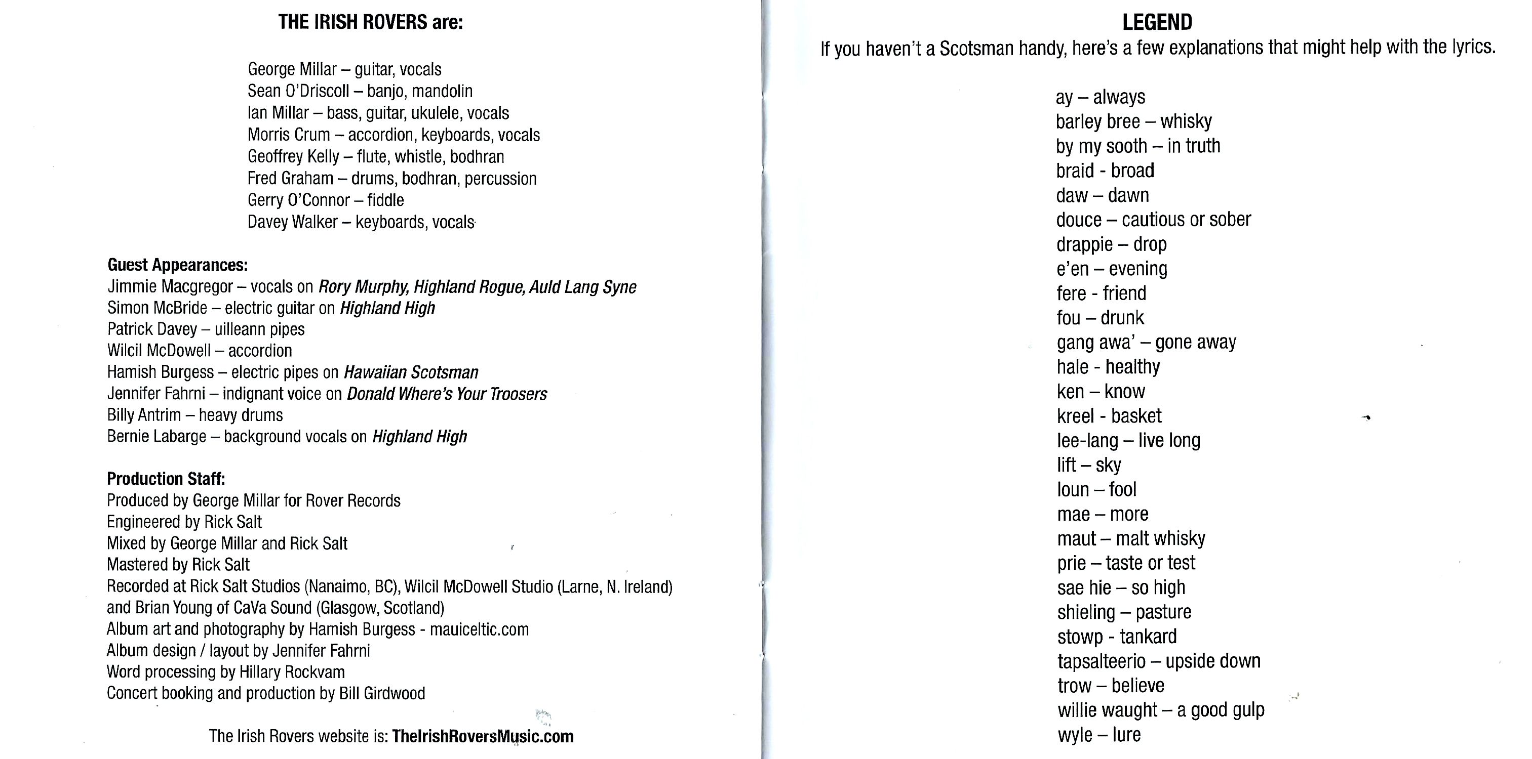 When Jimmy Ferguson and I started singing together in the early sixties, our repertoire was rather scanty to say the least. We knew three Irish songs, "The Irish Rover", "The Star of the County Down", and "Whiskey in the Jar", and we also knew three Scottish songs, "Donald Where's Your Troosers", "Johnny Lad" and "Nancy Whisky". We actually knew a couple of Lonnie Donnegan's English songs as well, but we'll talk of those at a different time. Well, to make a short story long, we've added a good few songs since then, and funnily enough, many of them are indeed still Scottish, hence the reason for this recording. We asked our old friend Jimmie Macgregor to join us on a few songs, and to our delight, he agreed. Jimmie, with his partner Robin Hall, were one of Scotland's finest folk bands, and the Rovers were avid fans. Thank you — Jimmie and "May yer lum never reek." There are some old songs here, and some new ones. You can sing or march along with some of them, (good exercise for you) or you can sit and relax with a wee sip of Highland whisky (good exercise for you). Yes, we've been known to stray from our Irish whiskey once in a while. When in Rome …