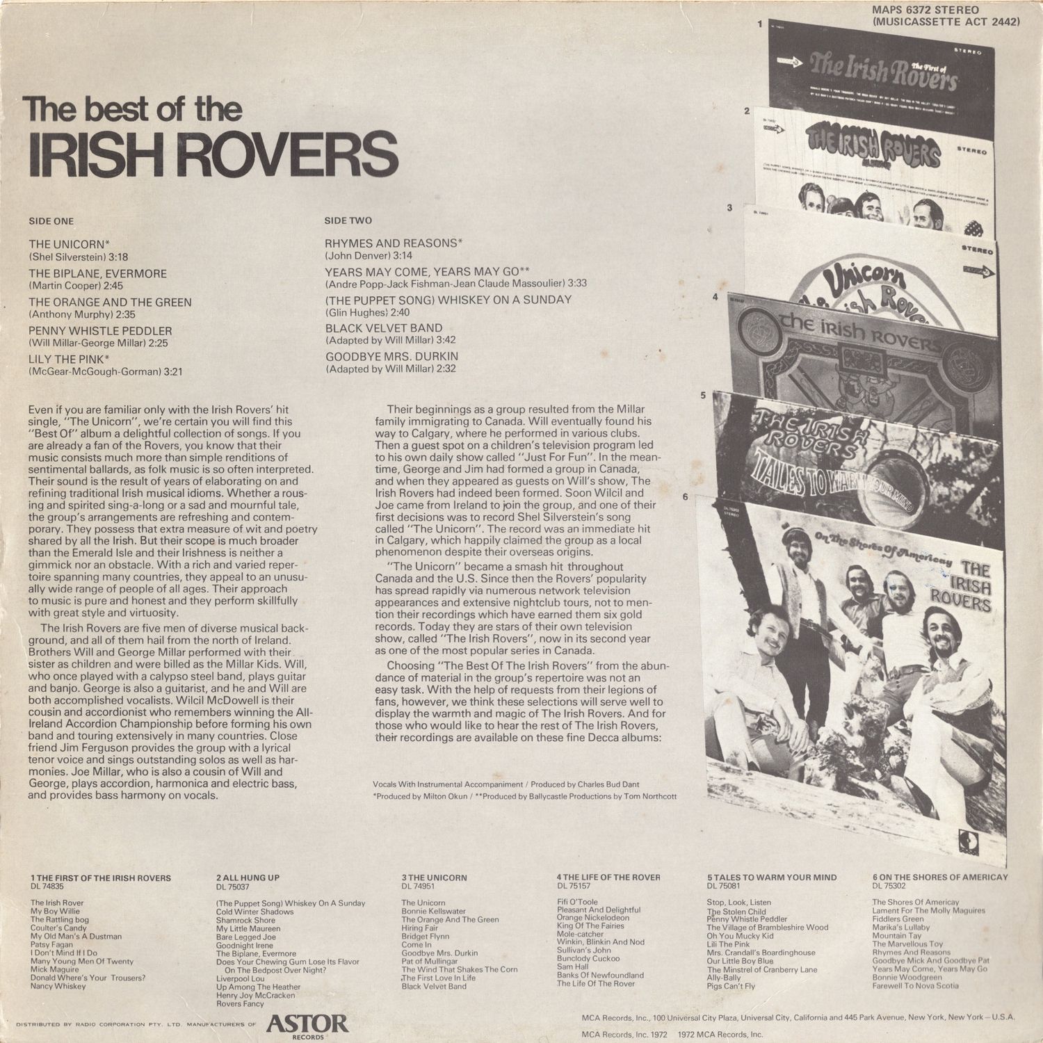 Choosing "The Best Of The Irish Rovers” from the abundance of material in the group's repertoire was not an easy task. With the help of requests from their legions of fans, however, we think these selections will serve well to display the warmth and magic of The Irish Rovers. And for those who would like to hear the rest of The Irish Rovers, their recordings are available on these fine Decca albums: