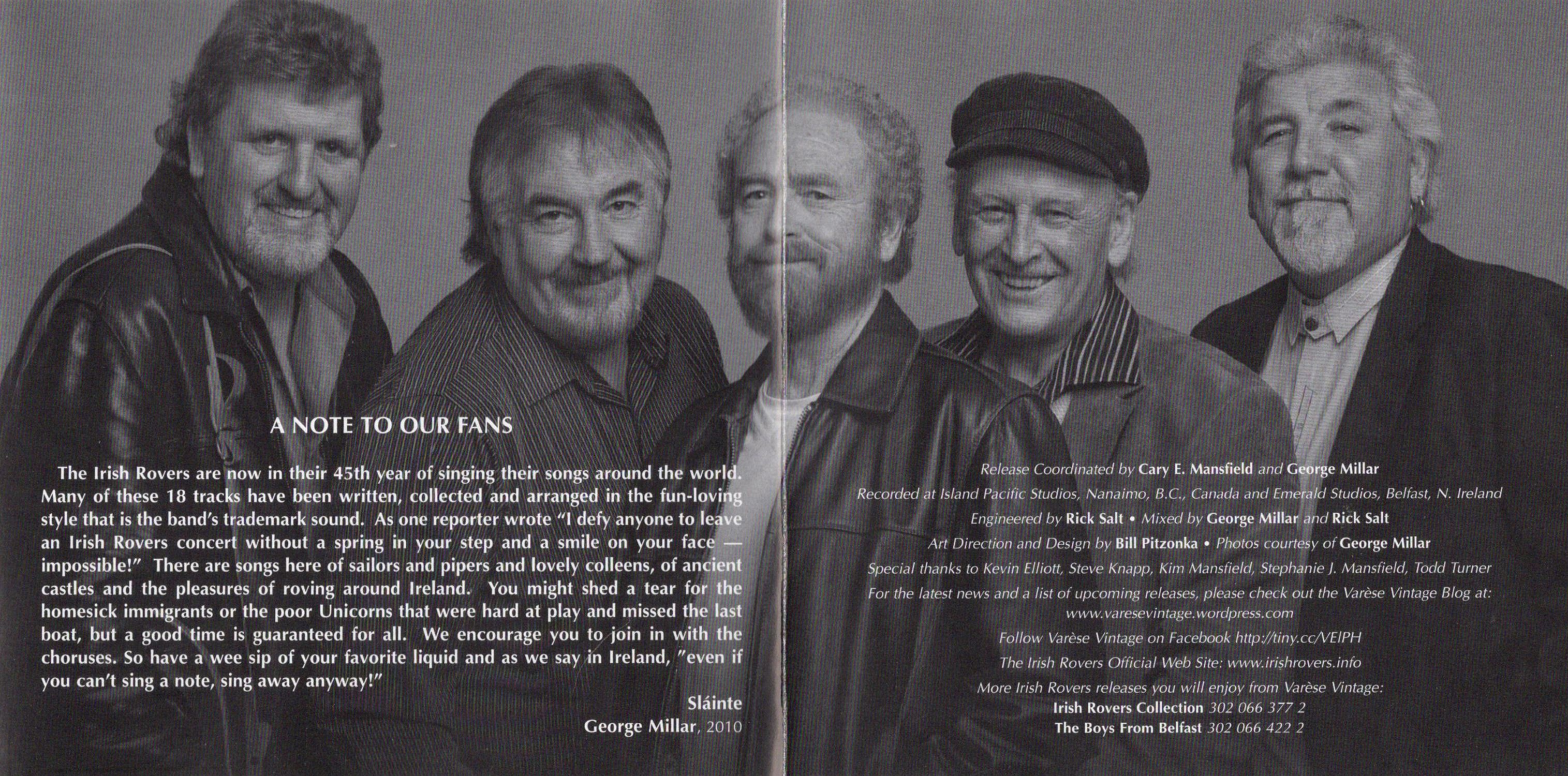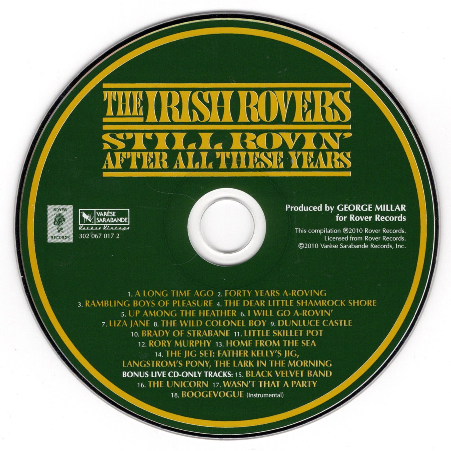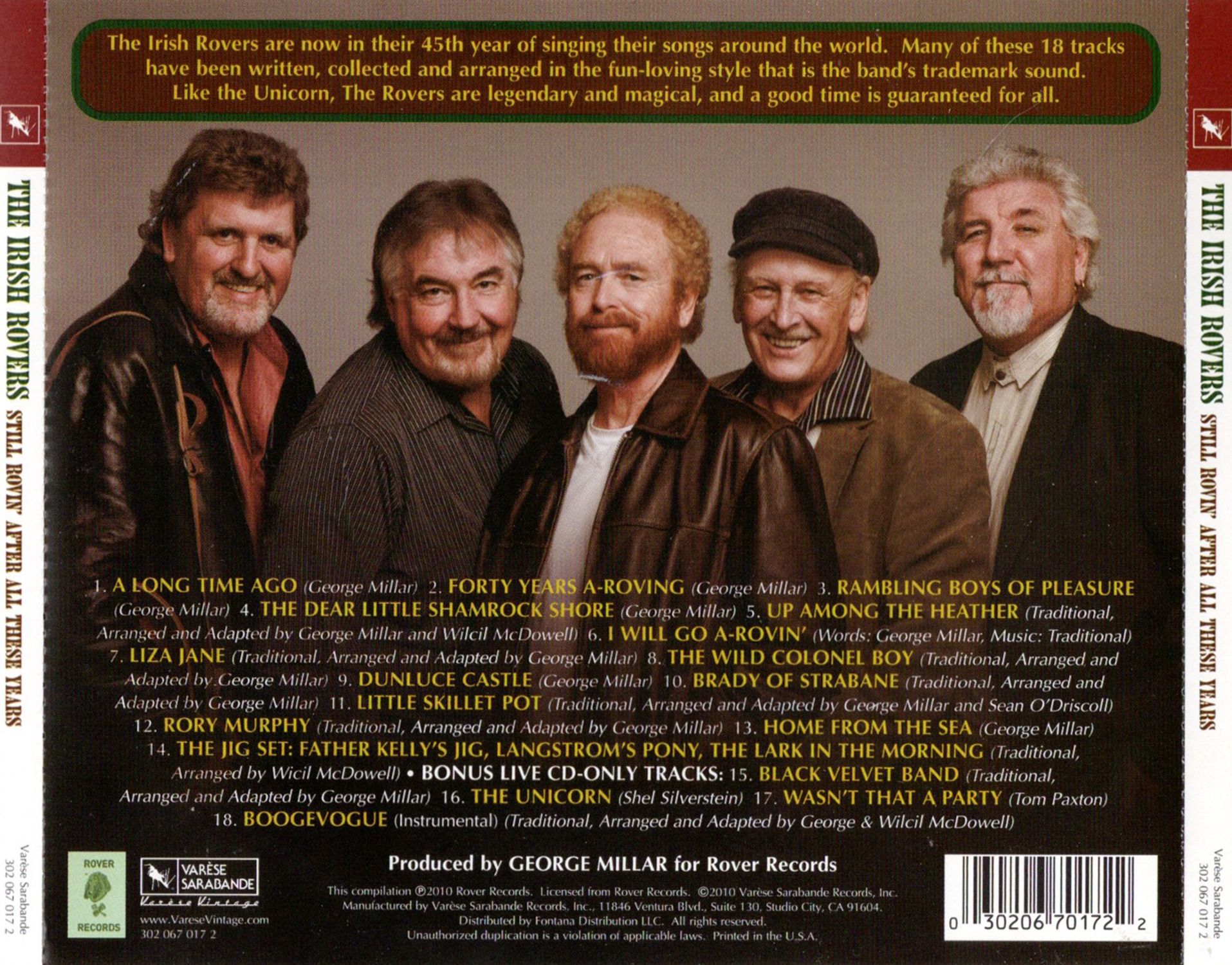 The Irish Rovers are now in their 45th year of singing their songs around the world Many of these 18 tracks have been written, collected and arranged in the fun-loving style that is the band's trademark sound. As one reporter wrote "I defy anyone to led an Irish Rovers concert without a spring in your step and a smile on your face impossible!" There are songs here of sailors and pipers and lovely colleens, of ancient castles and the pleasures of roving around Ireland. You might shed a tear for the homesick immigrants or the poor Unicorns that were hard at play and missed the last boat, but a good time is guaranteed for all. We encourage you to join in choruses. So have a wee sip of your favorite liquid and as we say in Ireland, "even you can't sing a note, sing away anyway!"