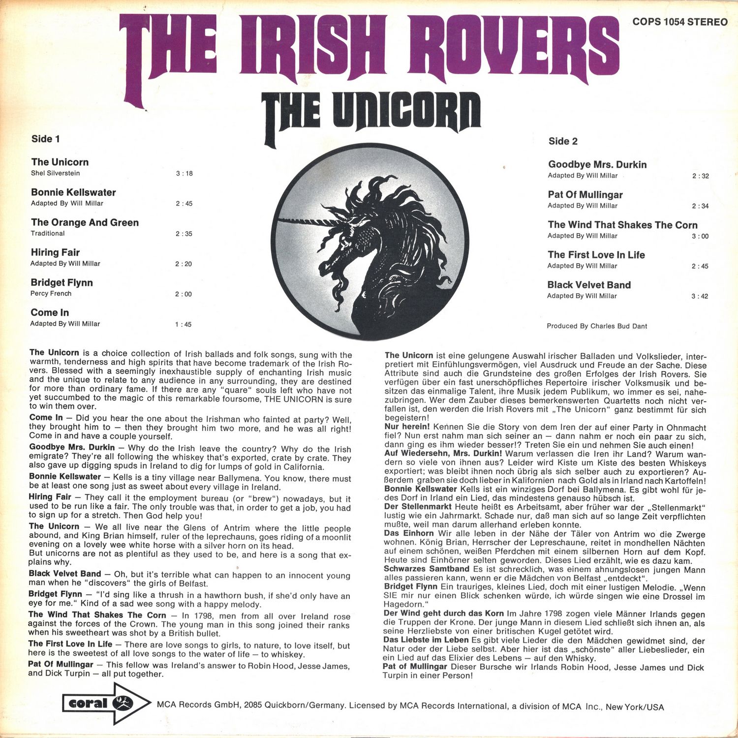 The Unicorn is a choice collection of Irish ballads and folk songs, sung with the warmth, tenderness and high spirits that have become trademark of the Irish Rovers. Blessed with a seemingly inexhaustible supply of enchanting Irish music and the unique to relate to any audience in any surrounding, they are destined for more than ordinary fame. If there are any "quare" souls left who have not yet succumbed to the magic of this remarkable foursome, THE UNICORN is sure to win them over.