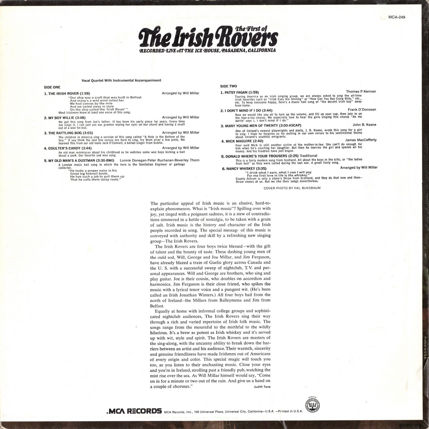 The particular appeal of Irish music is an elusive, hard-to-explain phenomenon. What is "Irish music"? Spilling over with joy, yet tinged with a poignant sadness, it is a stew of contradictions simmered in a kettle of nostalgia, to be taken with a grain of salt. Irish music is the history and character of the Irish people recorded in song. The special message of this music is conveyed with authority and skill by a refreshing new singing group—The Irish Rovers.