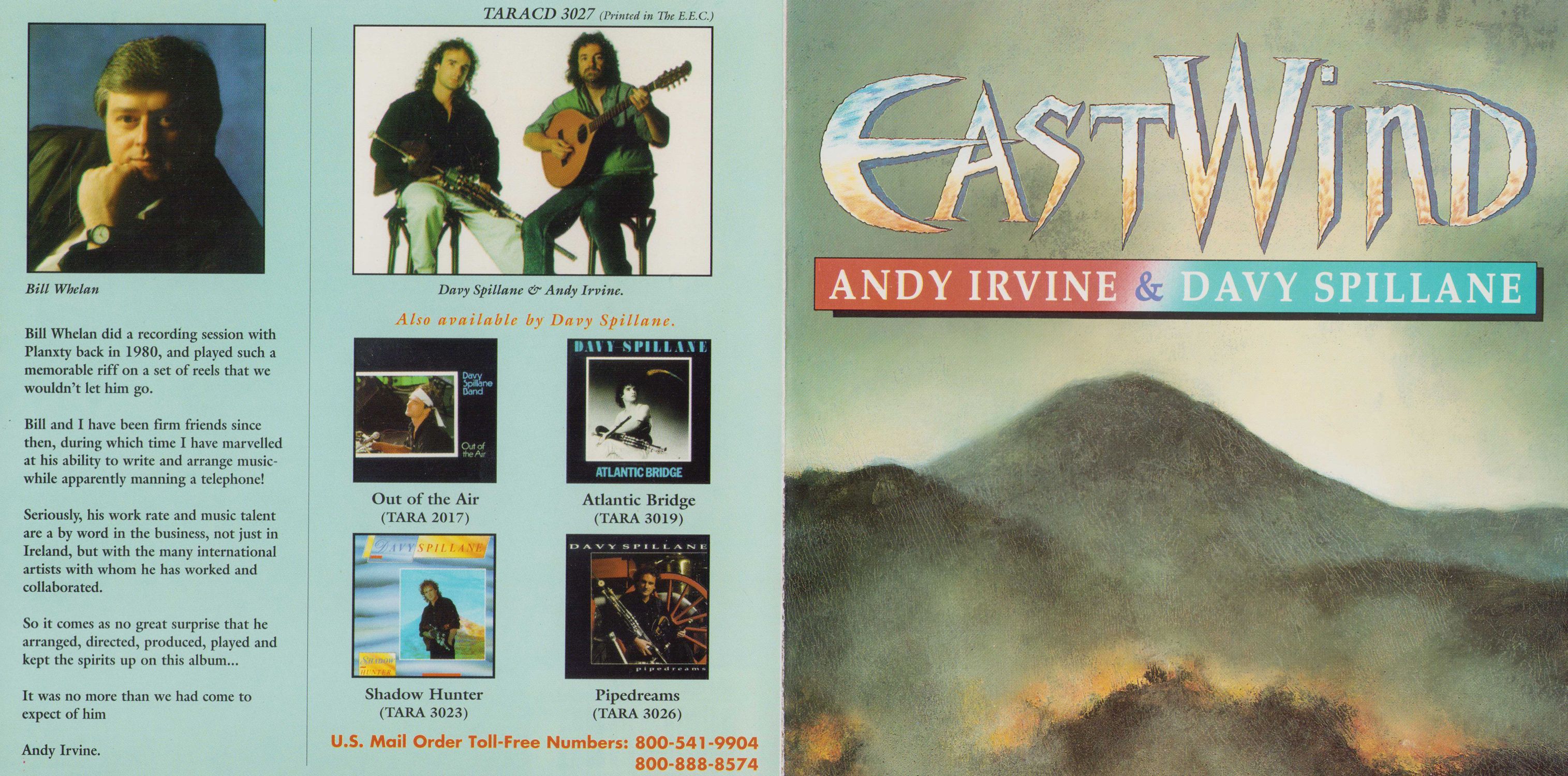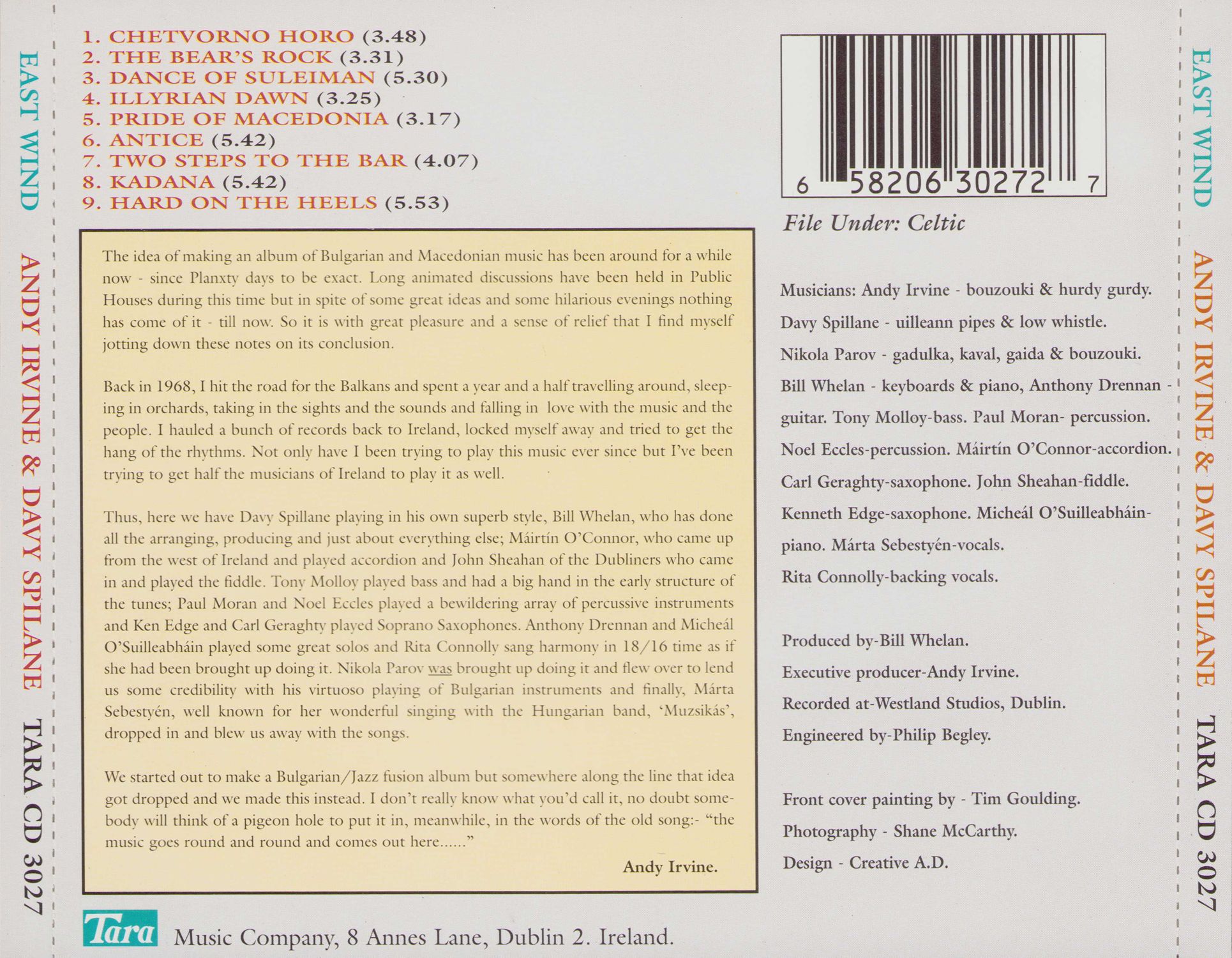 Thus, here we have Davy Spillane playing in his own superb style, Bill Whelan, who has done all the arranging, producing and just about everything else: Máirtín O Connor, who came up from the west of Ireland and played accordion and John Sheahan of the Dubliners who came in and played fiddle. Tony Molloy played bass and had a big hand in the early structure of the tunes; Paul Moran and Noel Eccles played a bewildering array of percussive instruments and Ken Edge and Carl Geraghty played Soprano Saxophones. Anthony Drennan and Micheal O'Suilleabhain played some great solos and Rita Connolly sang harmony in 18/16 time as if she had been brought up doing it. Nikola Parvo was brought up doing it and flew over to lend us some credibility with his virtuoso playing of Bulgarian instruments and finally, Márta Sebestyén, well known for her wonderful singing with the Hungarian band, 'Muzsikas', dropped in and blew us away with the songs.