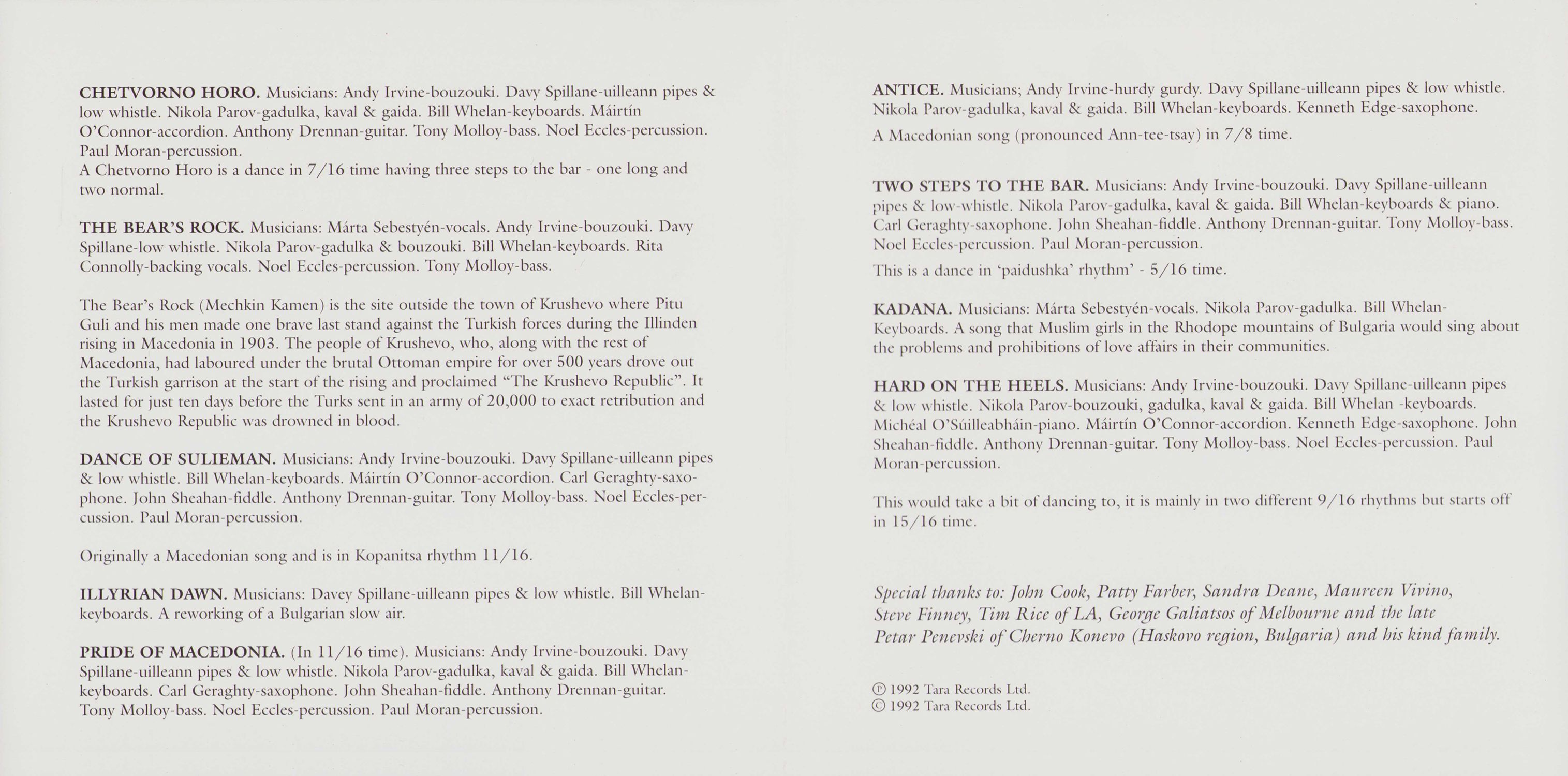 The idea of making an album of Bulgarian and Macedonian music has been around for a while now — since Planxty days to be exact. Long animated discussions have been held in Public Houses during this time but in spite of some great ideas and some hilarious evenings nothing has come of it — till now. So it is with great pleasure and a sense of relief that I find myself jotting down these notes on its conclusion.