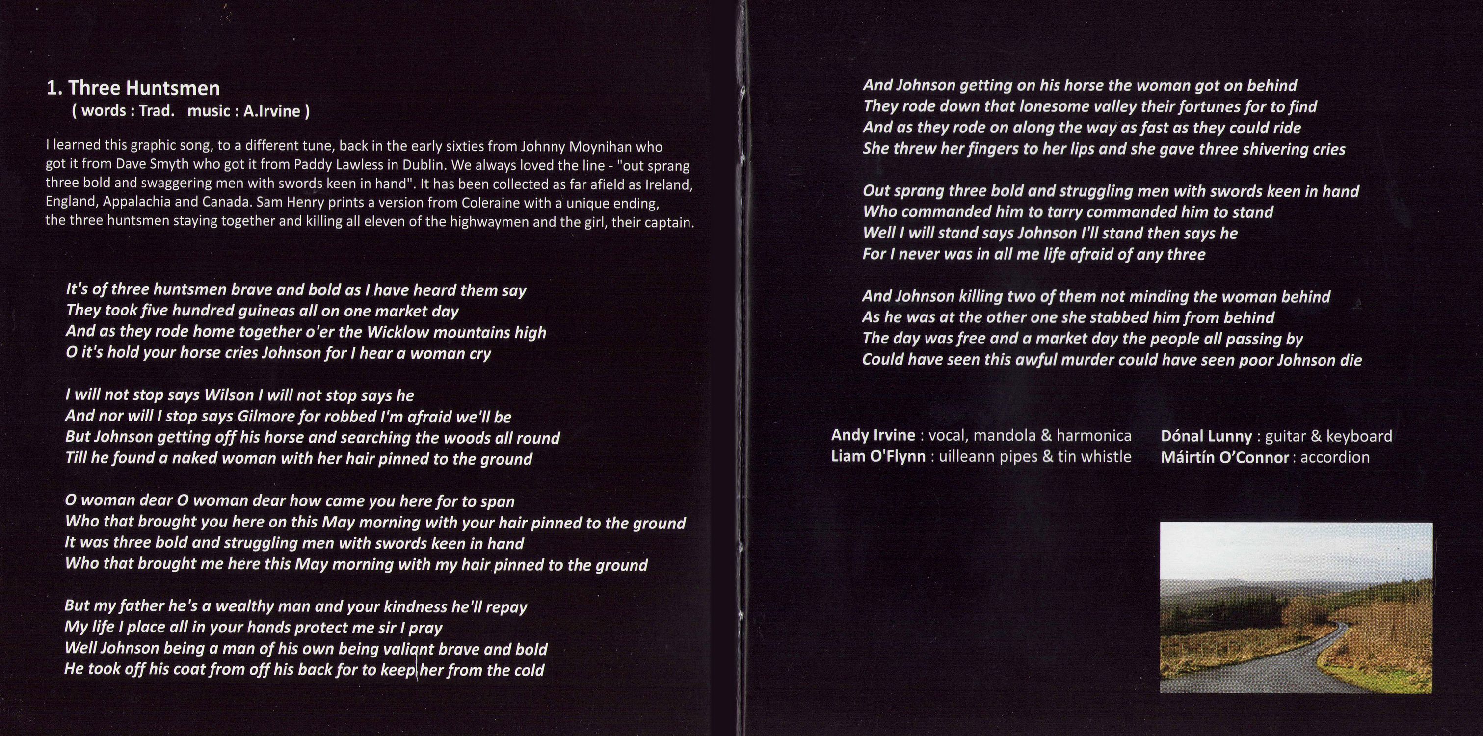 Three Huntsmen — I learned this graphic song, to a different tune, back in the early sixties from Johnny Moynihan who got it from Dave Smyth who got it from Paddy Lawless in Dublin. We always loved the line — "out sprang three bold and swaggering men with swords keen in hand". It has been collected as far afield as Ireland, England, Appalachia and Canada. Sam Henry prints a version from Coleraine with a unique ending, the three huntsmen staying together and killing all eleven of the highwaymen and the girl, their captain.