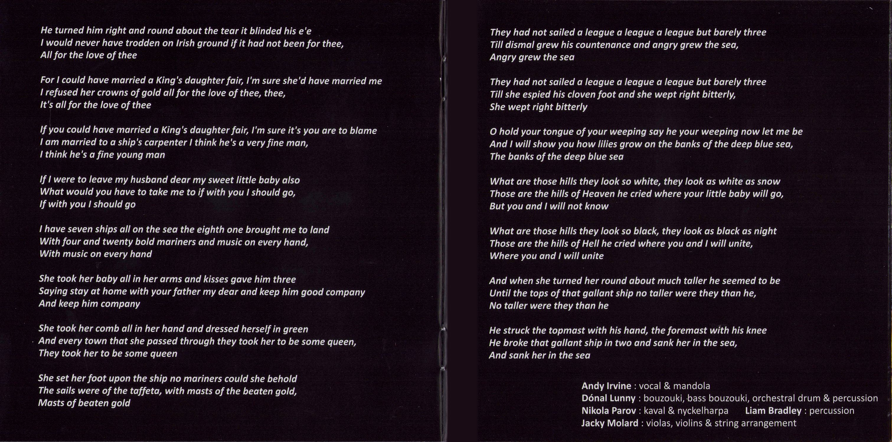 Thanks to all the other musicians who played on this album, Liam O'Flynn, Máirtín O'Connor, Annbjørg Lien, Lillebjørn Nilsen, Nikola Parov, Jacky Molard, Bruce Molsky, Rens van der Zalm, Rick Epping, Graham Henderson, Paul Moore, Liam Bradley, Kate Burke and Ruth Hazleton.