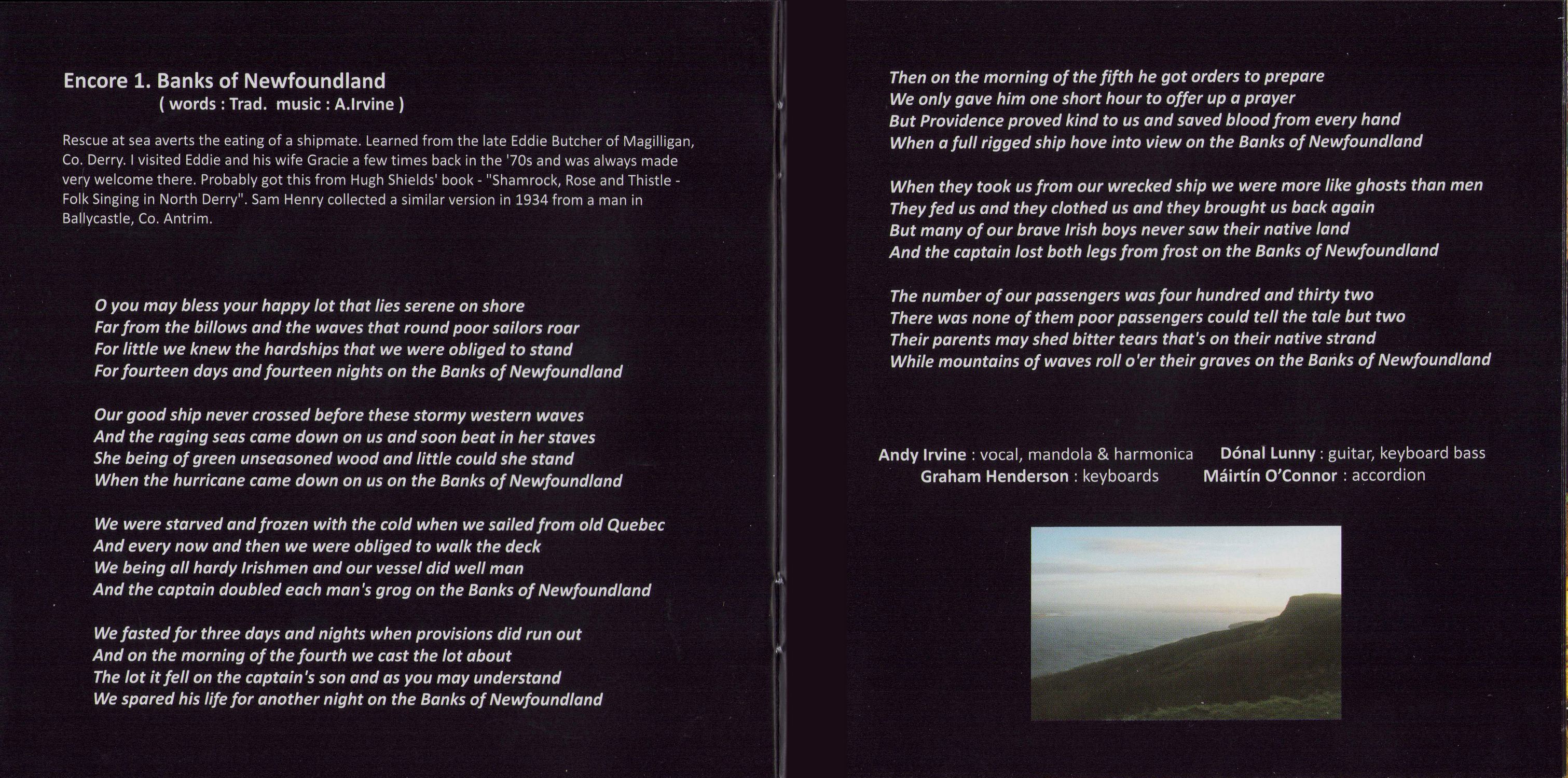 Banks of Newfoundland — Rescue at sea averts the eating of a shipmate. Learned from the late Eddie Butcher of Magilligan, Co. Derry. I visited Eddie and his wife Gracie a few times back in the 70s and was always made very welcome there. Probably got this from Hugh Shields' book — "Shamrock, Rose and Thistle — Folk Singing in North Derry". Sam Henry collected a similar version in 1934 from a man in Ballycastle, Co. Antrim.