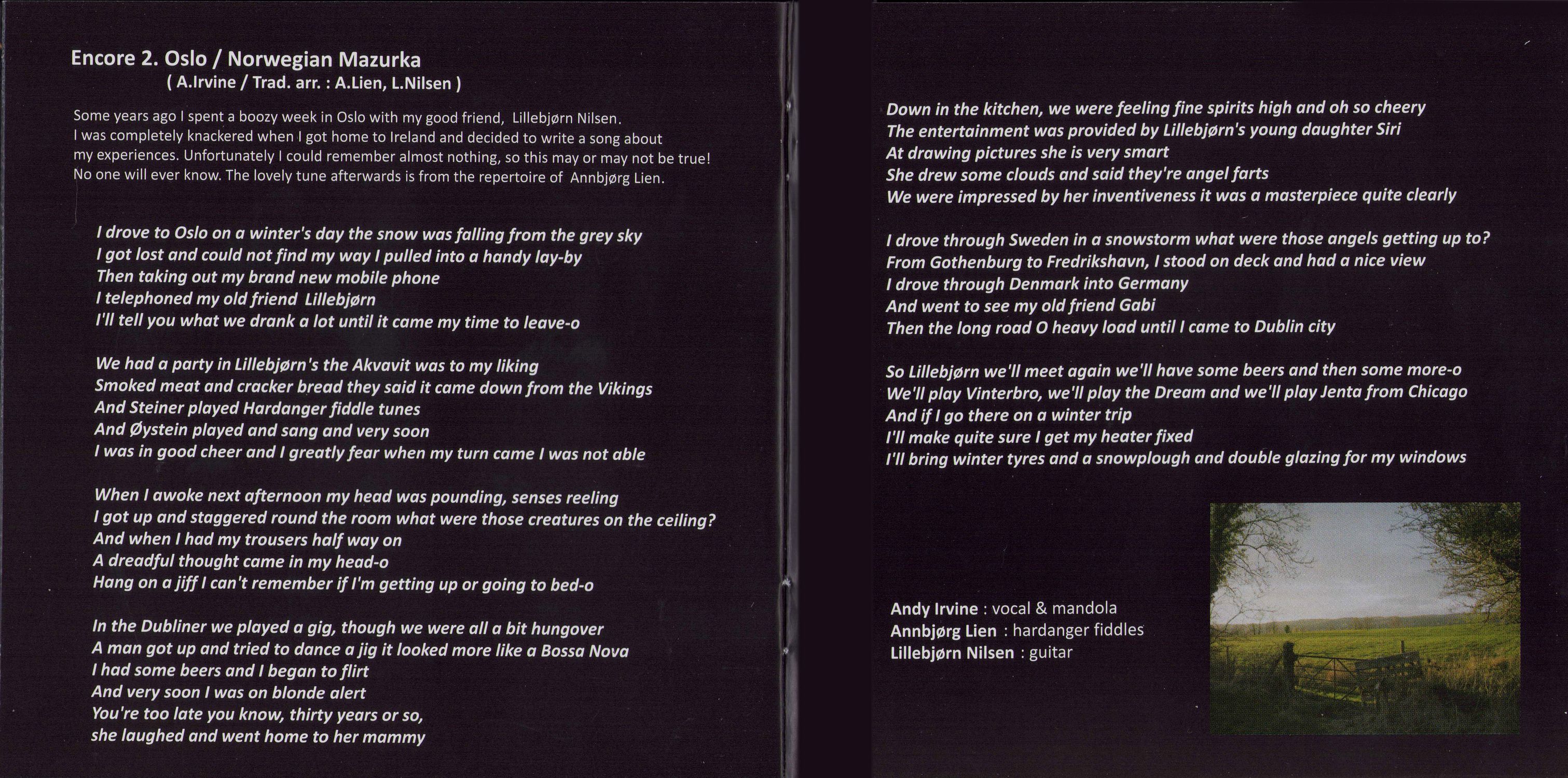 I was completely knackered when I got home to Ireland and decided to write a song about my experiences. Unfortunately I could remember almost nothing, so this may or may not be true! No one will ever know. The lovely tune afterwards is from the repertoire of Annbjørg Lien.