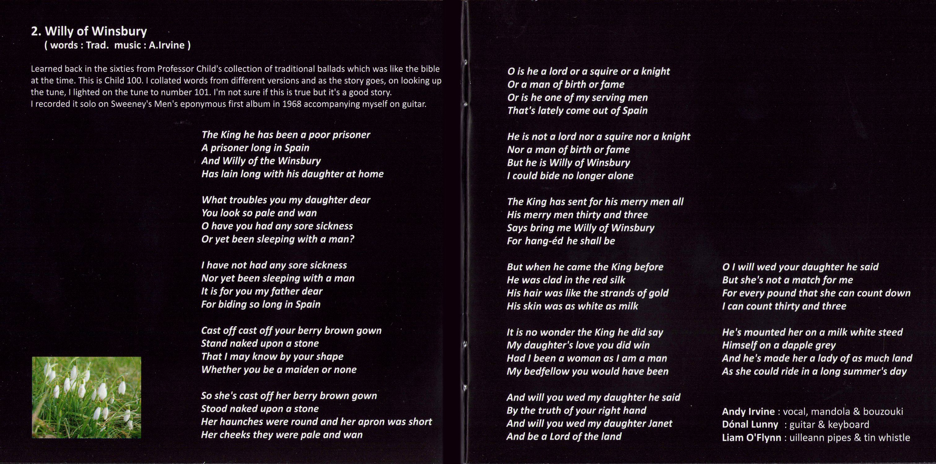 Willy of Winsbury — Learned back in the sixties from Professor Child's collection of traditional ballads which was like the bible at the time. This is Child 100. I collated words from different versions and as the story goes, on looking up the tune, I lighted on the tune to number 101. I'm not sure if this is true but it's a good story.