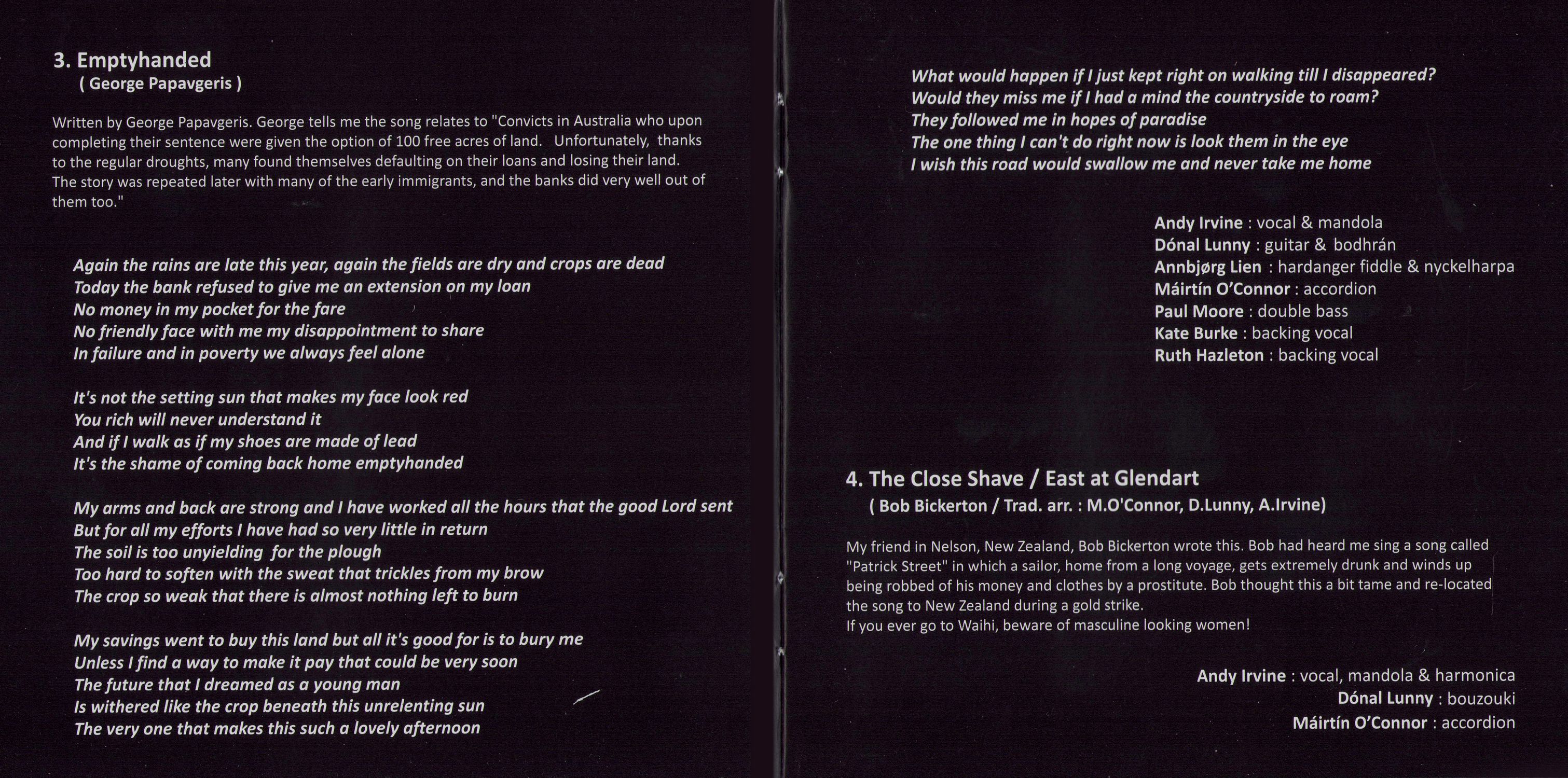 Emptyhanded — Written by George Papavgeris. George tells me the song relates to "Convicts in Australia who upon completing their sentence were given the option of 100 free acres of land. Unfortunately, thanks to the regular droughts, many found themselves defaulting on their loans and losing their land. The story was repeated later with many of the early immigrants, and the banks did very well out of them too."