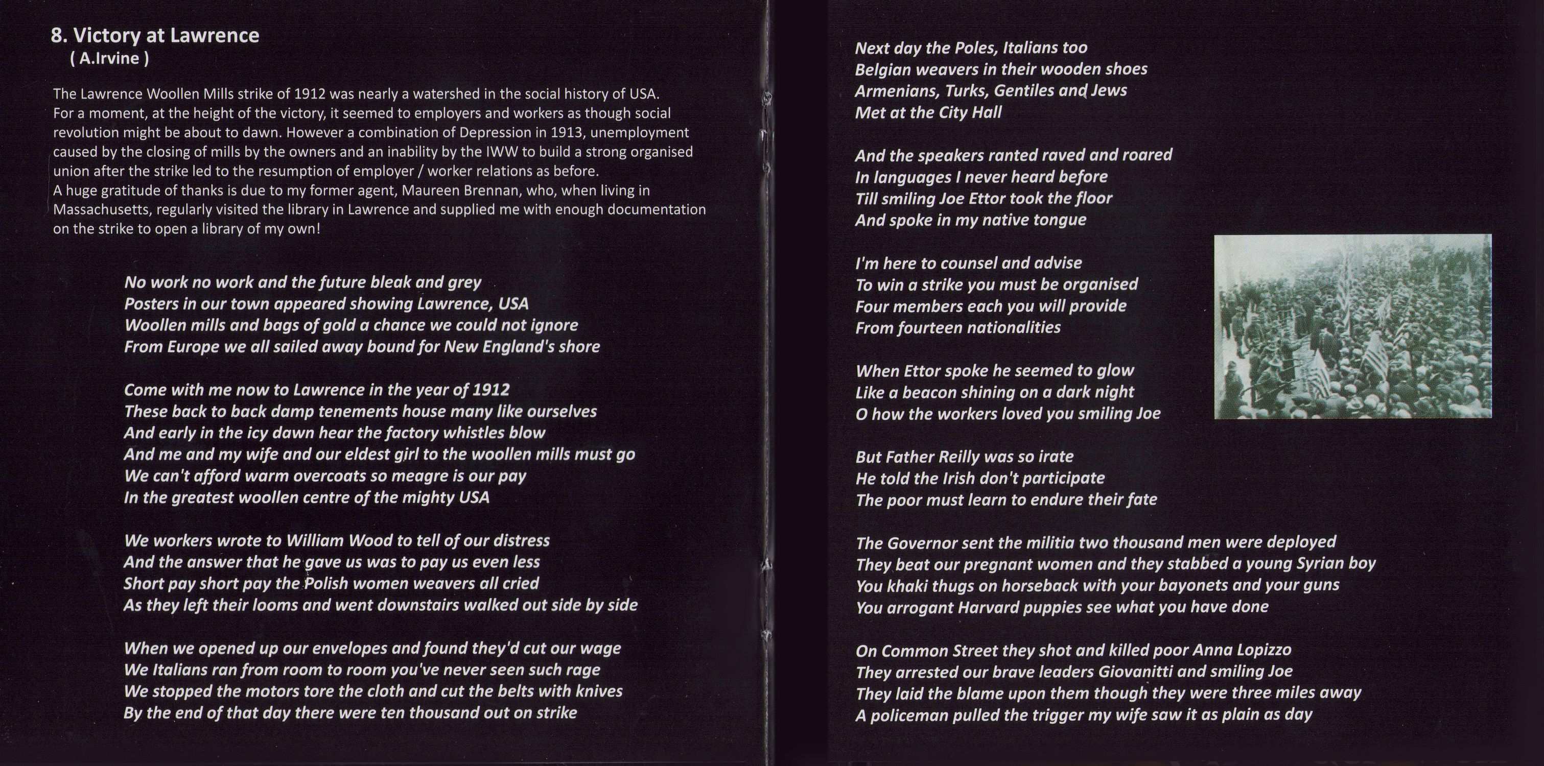 Victory at Lawrence — The Lawrence Woollen Mills strike of 1912 was nearly a watershed in the social history of USA. For a moment, at the height of the victory, it seemed to employers and workers as though social revolution might be about to dawn. However a combination of Depression in 1913, unemployment caused by the closing of mills by the owners and an inability by the IWW to build a strong organised union after the strike led to the resumption of employer/worker relations as before.