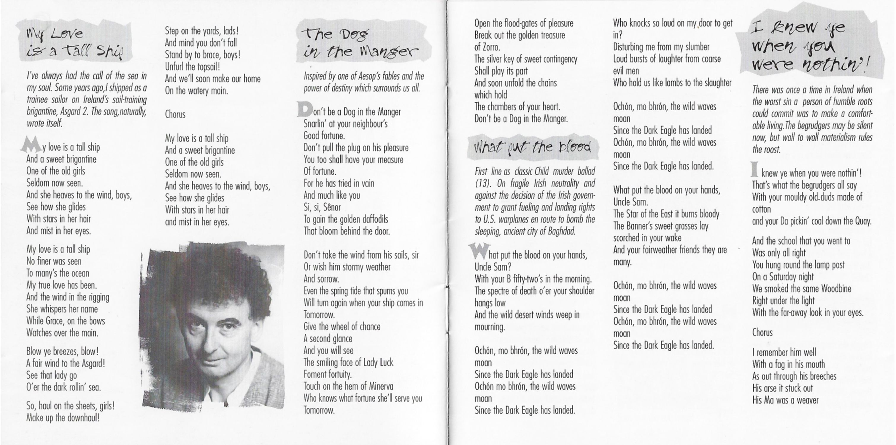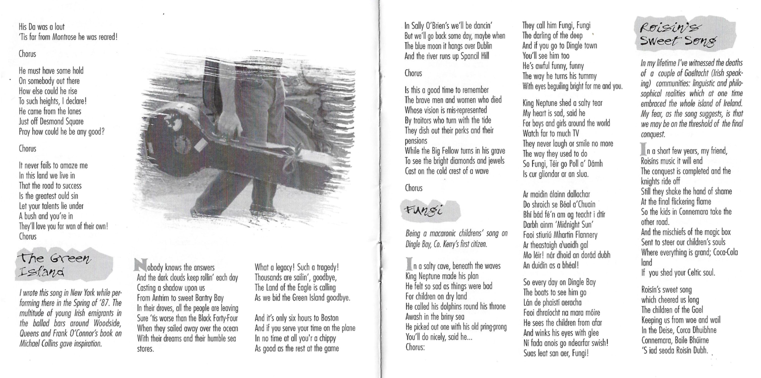The Green Island — I wrote this song in New York while performing there in the Spring of '87. The multitude of young Irish emigrants in the ballad bars around Woodside, Queens and Frank O'Connor's book on Michael Collins gave inspiration.
