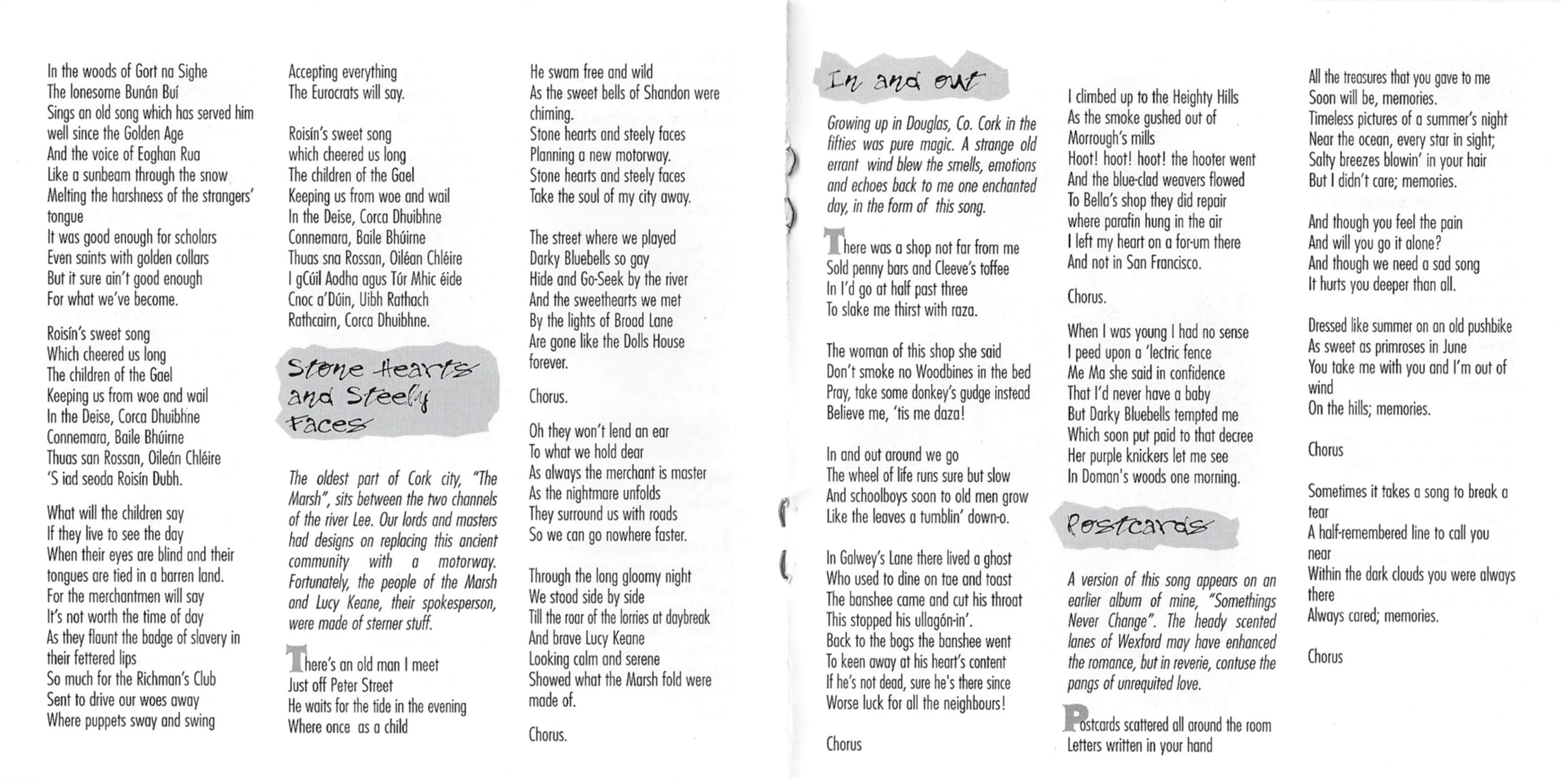 Postcards — A version of this song appears on an earlier album of mine, "Somethings Never Change". The heady scented lanes of Wexford may have enhanced the romance, but in reverie, contuse the pangs of unrequited love.