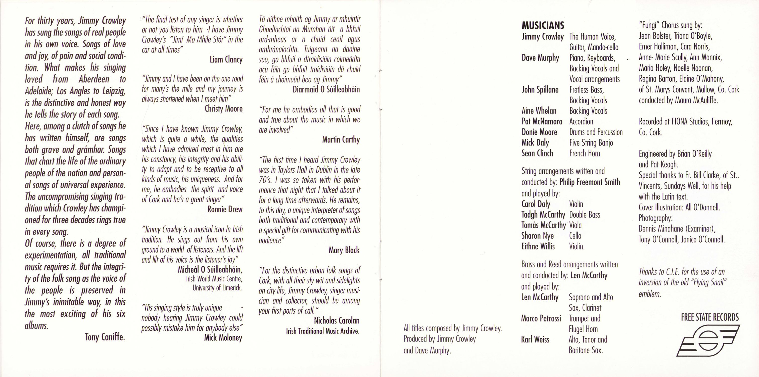 For thirty years, Jimmy Crowley has sung the songs of real people in his own voice. Songs of love and joy of pain and social condition. What makes his singing loved from Aberdeen to Adelaide; Los Angles to Leipzig, is the distinctive and honest way he tells the story of each song. Here, among a clutch of songs he has written himself, are songs both grave and grámhar. Songs that chart the life of the ordinary people of the nation and personal songs of universal experience. The uncompromising singing tradition which Crowley has championed for three decades rings true in every song.