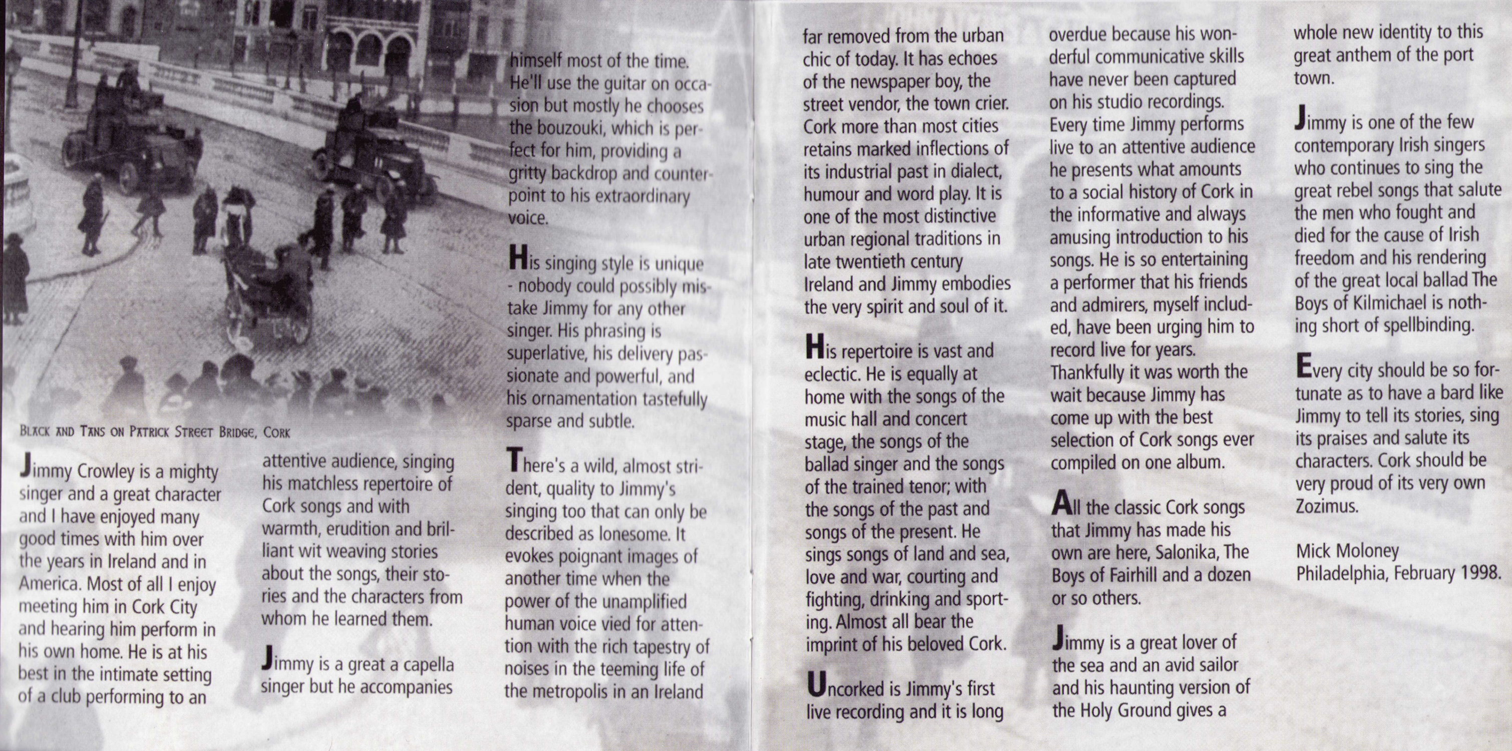 Jimmy Crowley is a mighty singer and a great character and I have enjoyed many good times with him over the years in Ireland and in America. Most of all I enjoy meeting him in Cork City and hearing him perform in his own home. He is at his best in the intimate setting of a club performing to an attentive audience, singing his matchless repertoire of Cork songs and with warmth, erudition and brilliant wit weaving stories about the songs, their stories and the characters from whom he learned them.