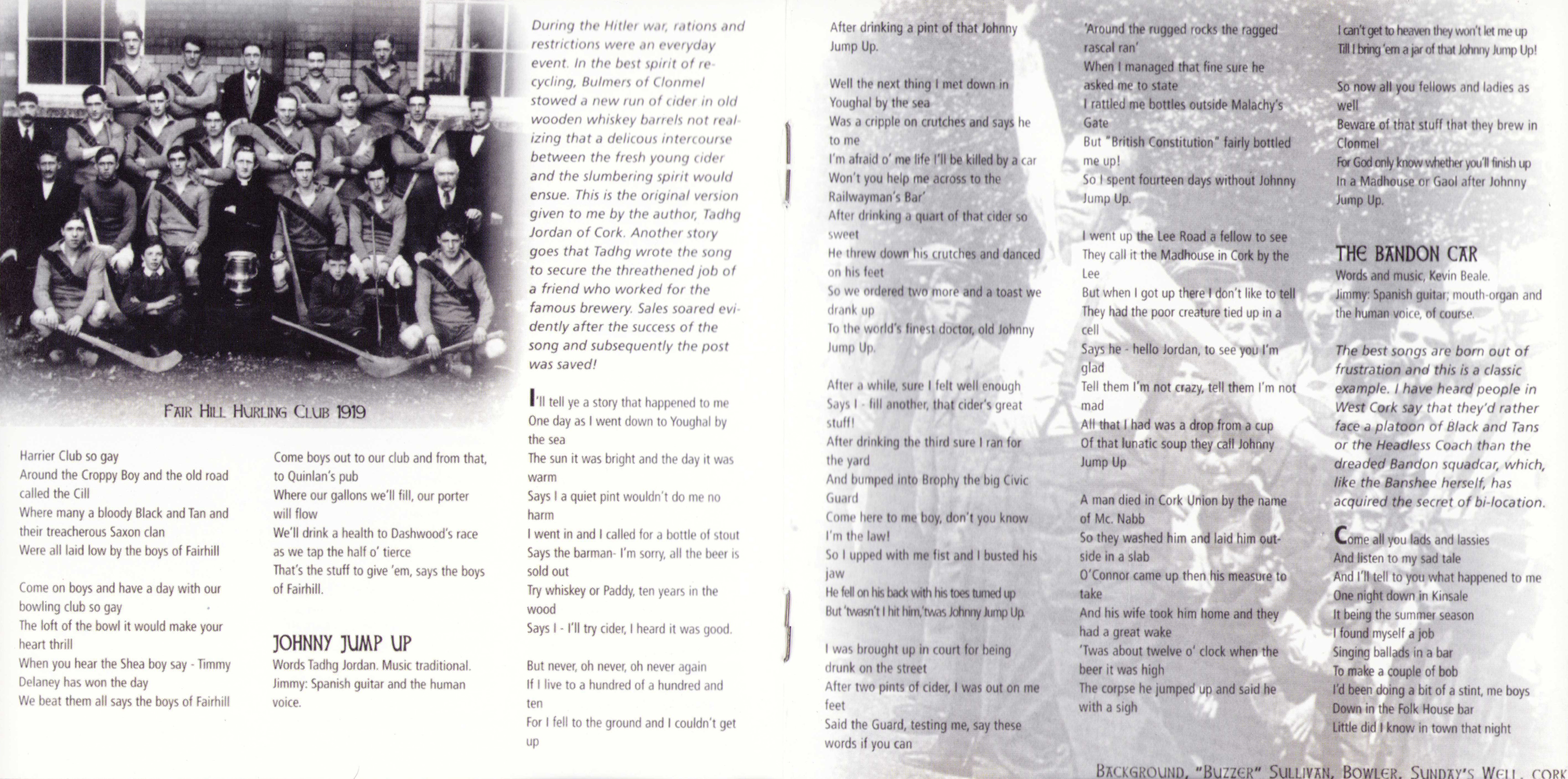 Johnny Jump Up — During the Hitler war, rations and restrictions were an everyday event In the best spirit of recycling, Bulmers of Clonmel stowed a new run of cider in old wooden whiskey barrels not realising that a delicious intercourse between the fresh young cider and the slumbering spirit would ensue. This the original version given to me by the author, Tadhg Jordan of Cork. Another story goes that Tadhg wrote the song to secure the threatened job of a friend who worked for the famous brewery. Sales soared evidently after the success of the song and subsequently the post was saved!