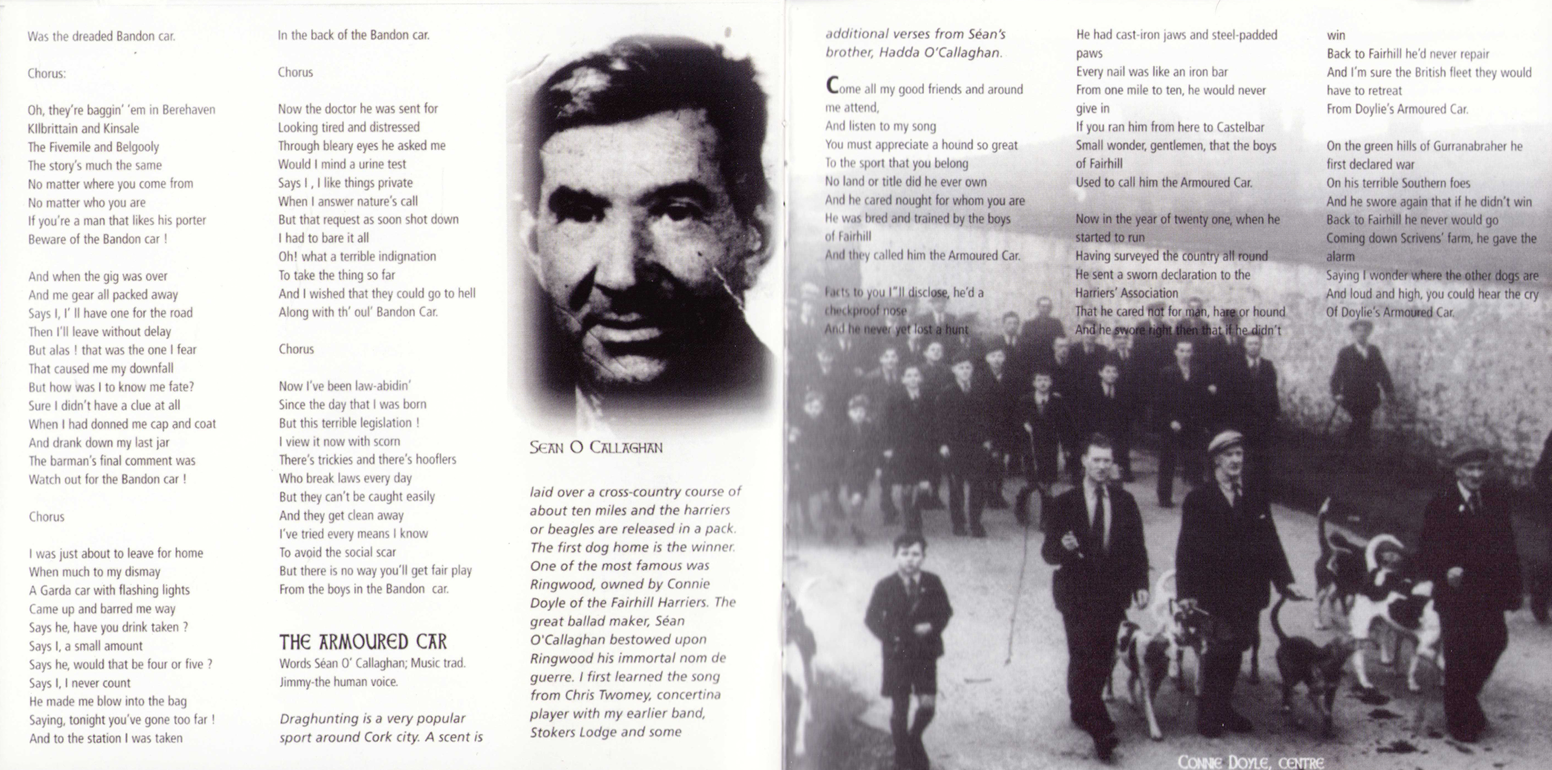 The Armoured Car — Draghunting is a very popular sport around Cork city. A scent is laid over a cross-country course of about ten miles and the harriers or beagles are released in a pack. The first dog home is the winner. One of the most famous was Ringwood, owned by Connie Doyle of the Fairhill Harriers. The great ballad maker, Seán O'Callaghan bestowed upon Ringwood his immortal nom de guerre. I first learned the song from Chris Twomey, concertina player with my earlier band, Stokers Lodge and some additional verses from Seán's brother, Hadda O'Callaghan.