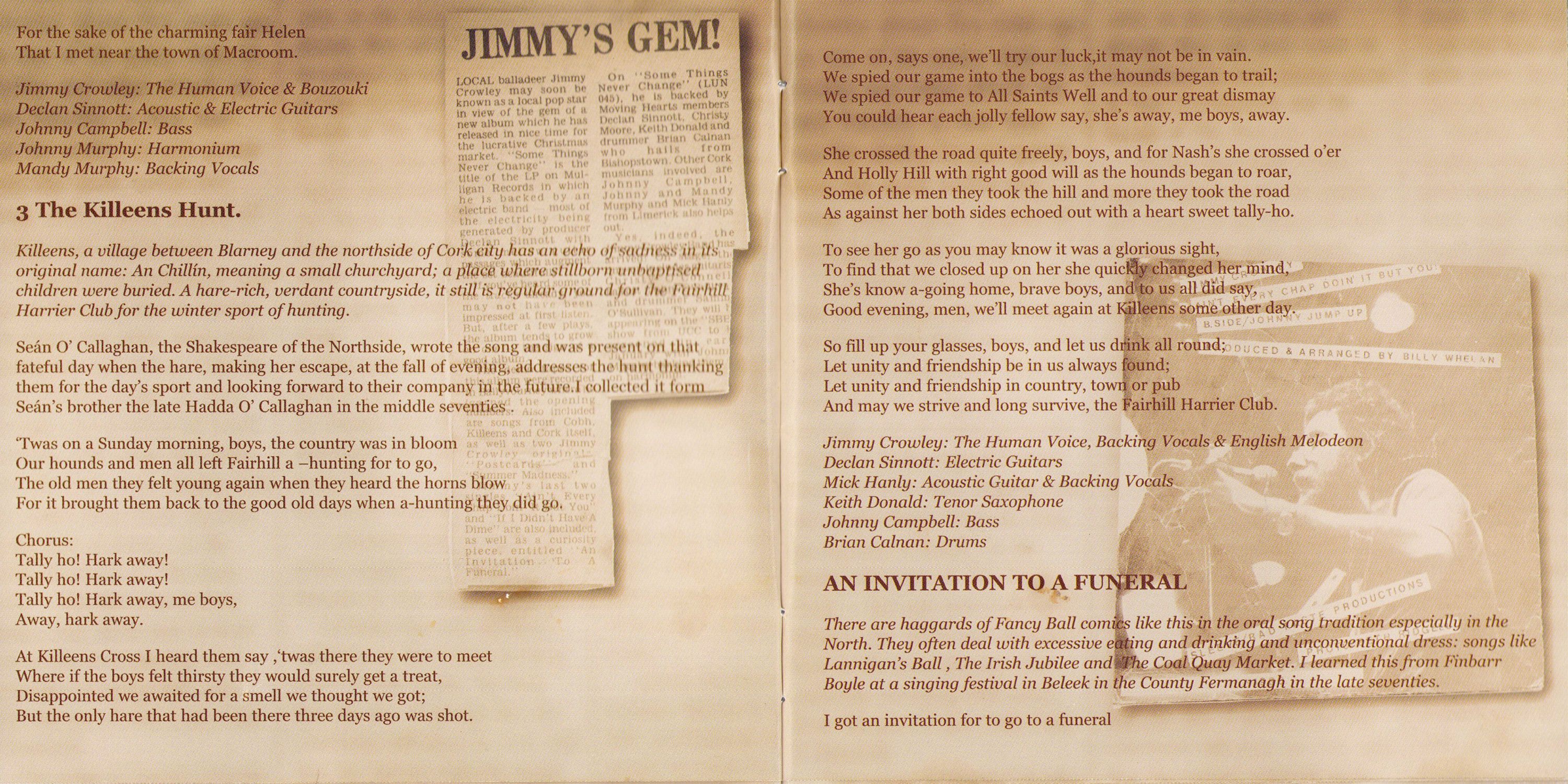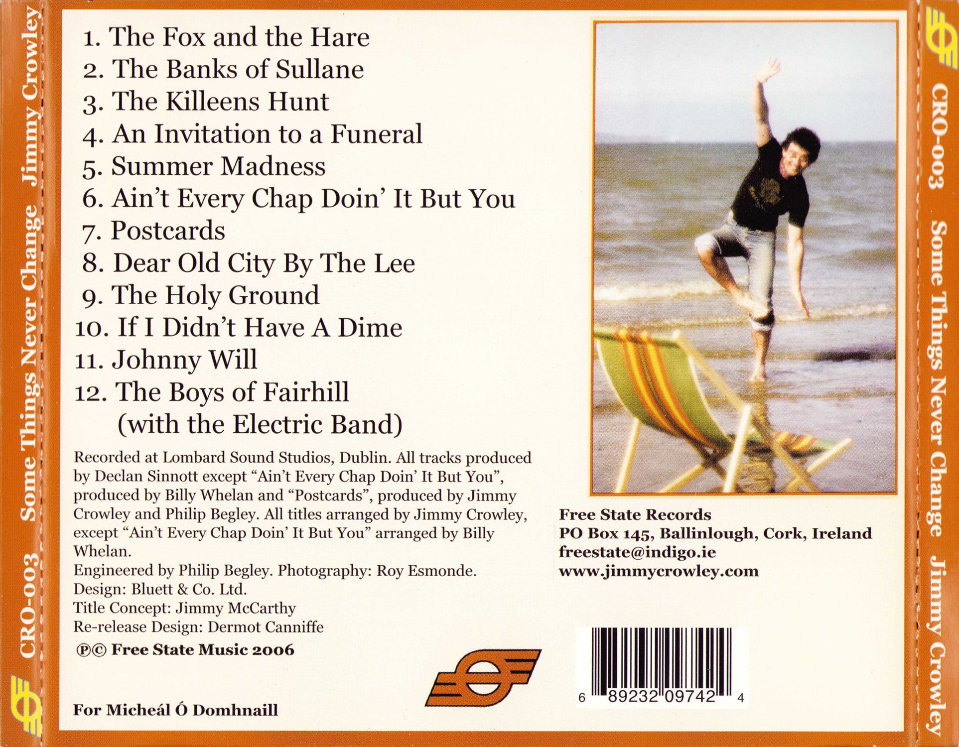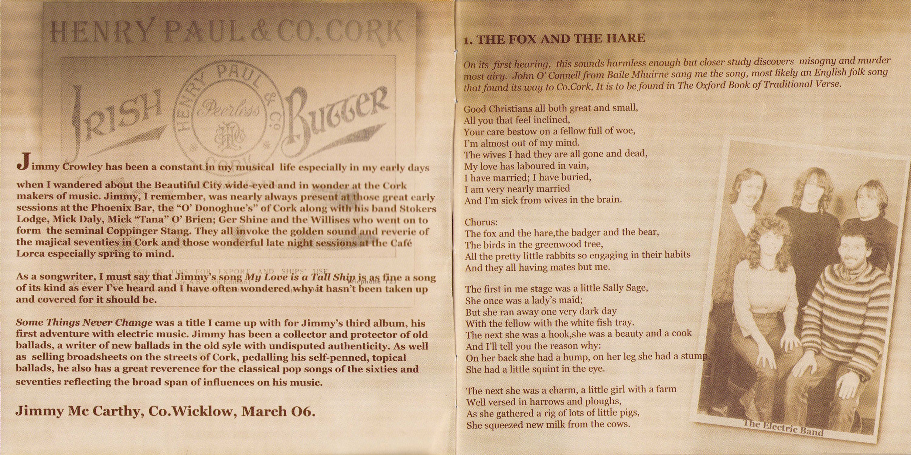 Some Things Never Change was a title I came up with for Jimmy's third album, his first adventure with electric music. Jimmy has been a collector and protector of old ballads, a writer of new ballads in the old style with undisputed authenticity. As well as selling broadsheets on the streets of Cork, pedalling his self-penned, topical ballads, he also has a great reverence for the classical pop songs of the sixties and seventies reflecting the broad span of influences on his music.
