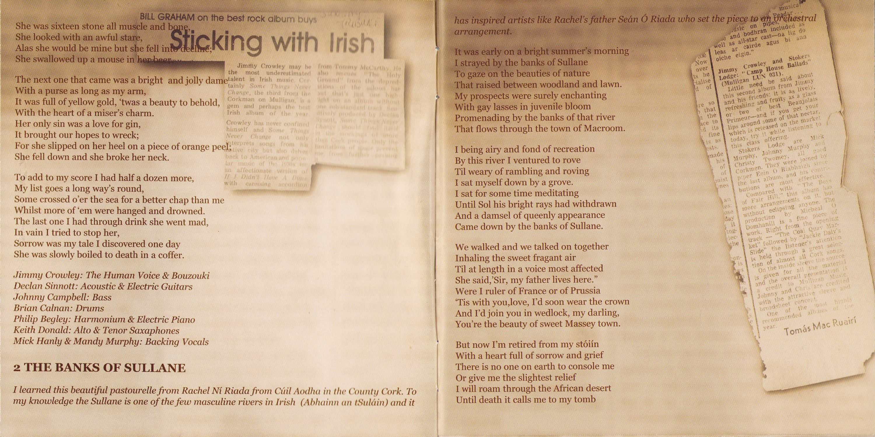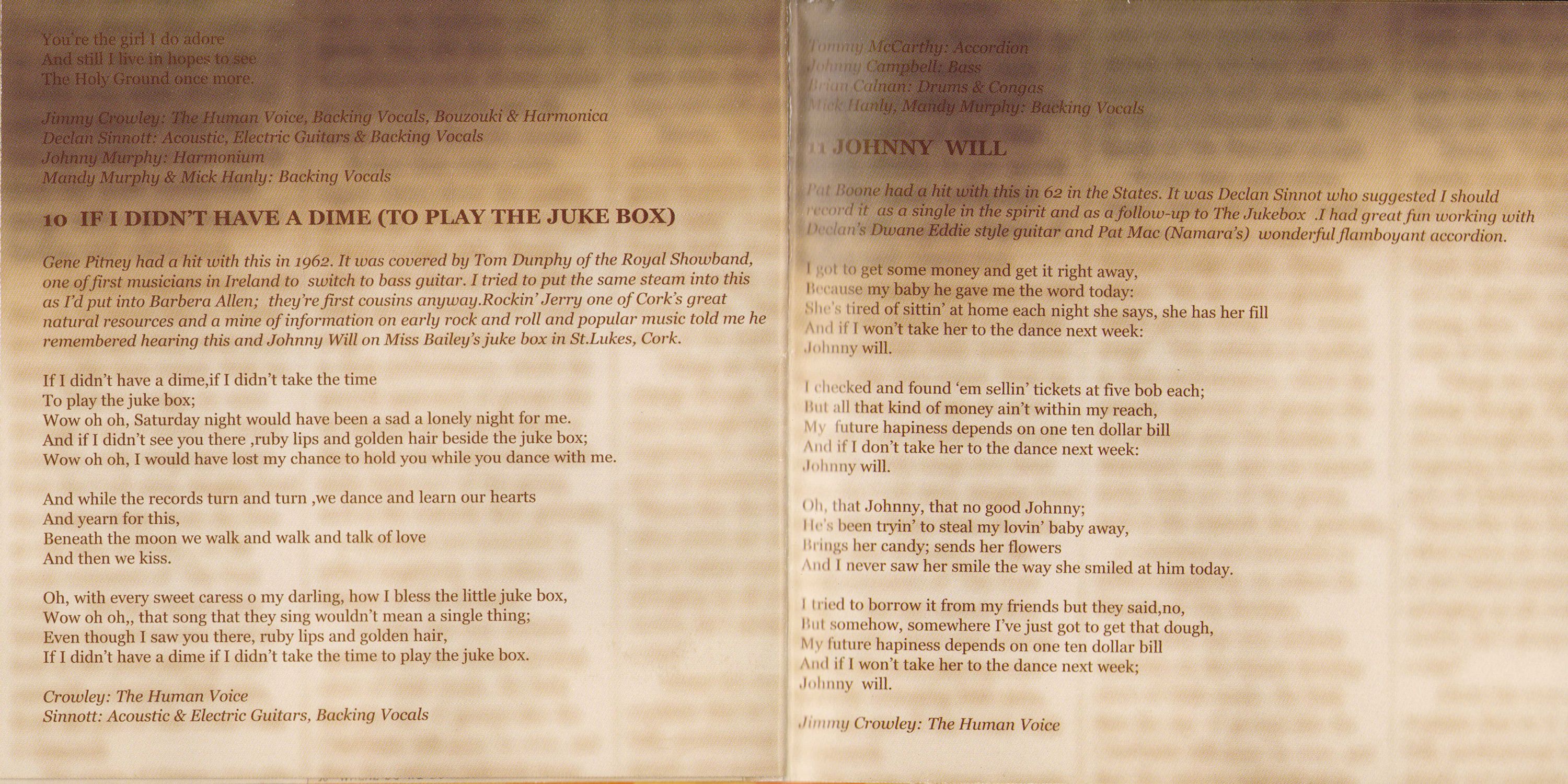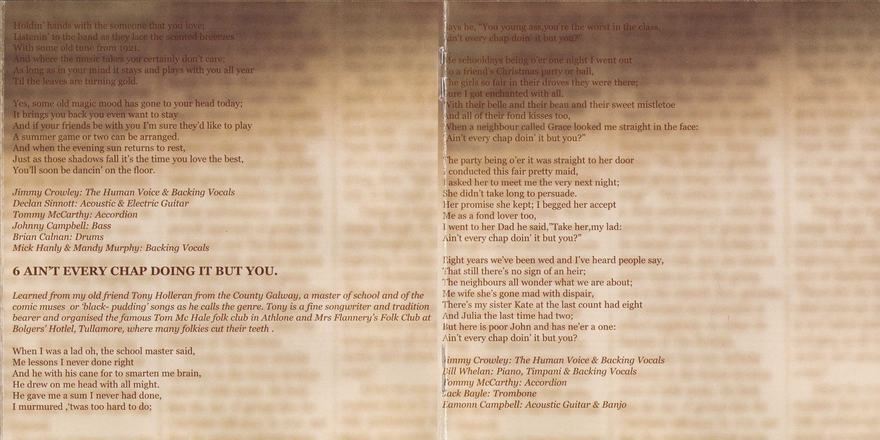 Jimmy Crowley has been a constant in my musical life especially in my early days when I wandered about the Beautiful City wide-eyed and in wonder at the Cork makers of music. Jimmy, I remember, was nearly always present at those great early sessions at the Phoenix Bar, the "O' Donoghue's" of Cork along with his band Stokers Lodge, Mick Daly, Mick "Tana" O'Brien; Ger Shine and the Willises who went on to form the seminal Coppinger Stang. They all invoke the golden sound and reverie of the magical seventies in Cork and those wonderful late night sessions at the Café Lorca especially spring to mind.