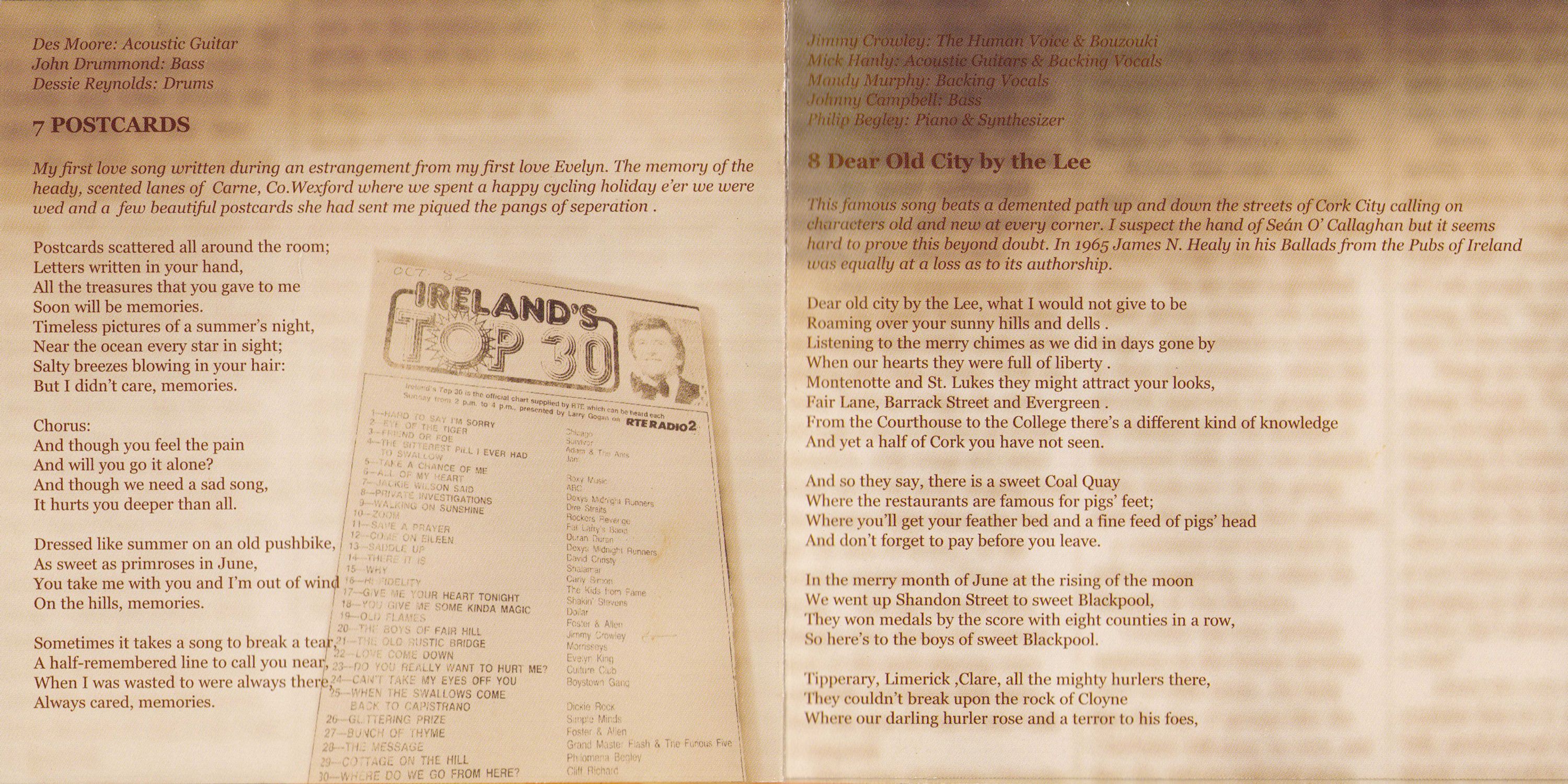 Postcards — My first love song written during an estrangement from my first love Evelyn. The memory of the heady, scented lanes of Carne, Co. Wexford where we spent a happy cycling holiday e'er we were wed and a few beautiful postcards she had sent me piqued the pangs of seperation.