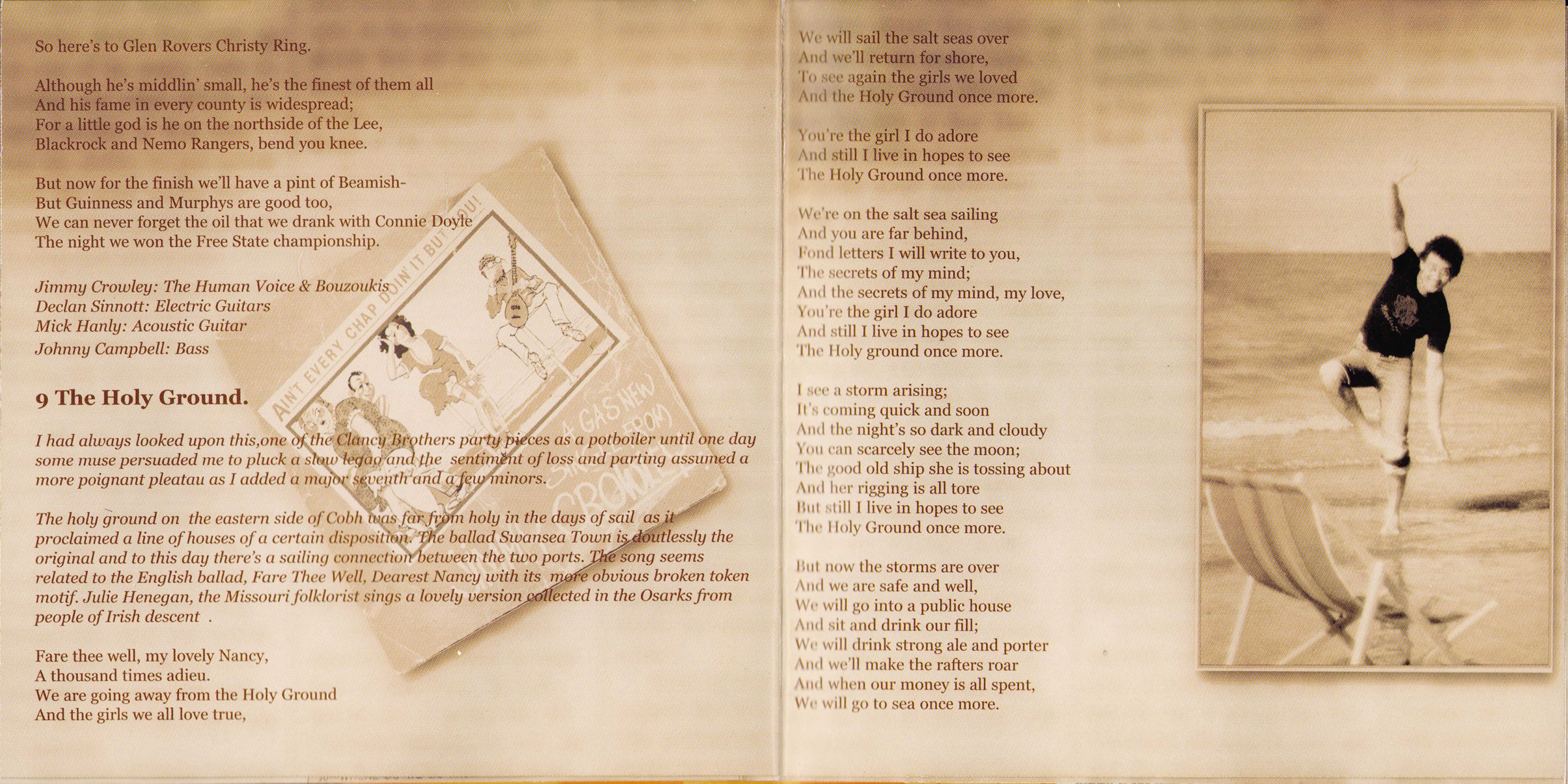 The Holy Ground — I had always looked upon this, one of the Clancy Brothers party pieces as a potboiler until one day some muse persuaded me to pluck a slow legao and the sentiment of loss and parting assumed a more poignant pleatau as I added a major seventh and a few minors.