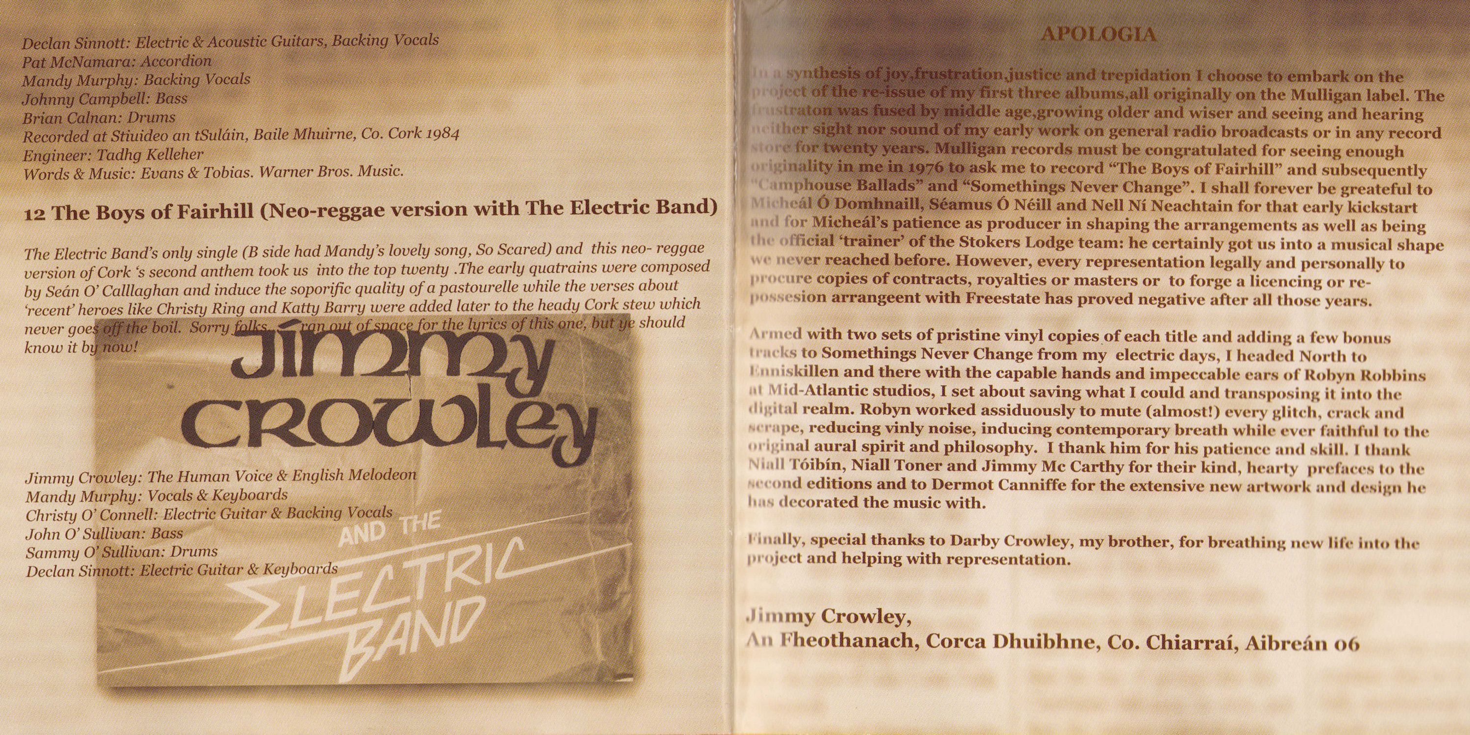Armed with two sets of pristine vinyl copies of each title and adding a few bonus tracks to Somethings Never Change from my electric days, I headed North to Enniskillen and there with the capable hands and impeccable ears of Robyn Robbins at Mid-Atlantic studios, I set about saving what I could and transposing it into the digital realm. Robyn worked assiduously to mute (almost!) every glitch, crack and scrape, reducing vinly noise, inducing contemporary breath while ever faithful to the original aural spirit and philosophy. I thank him for his patience and skill. I thank Niall Tóibín, Niall Toner and Jimmy McCarthy for their kind, hearty prefaces to the second editions and to Dermot Canniffe for the extensive new artwork and design he has decorated the music with.
